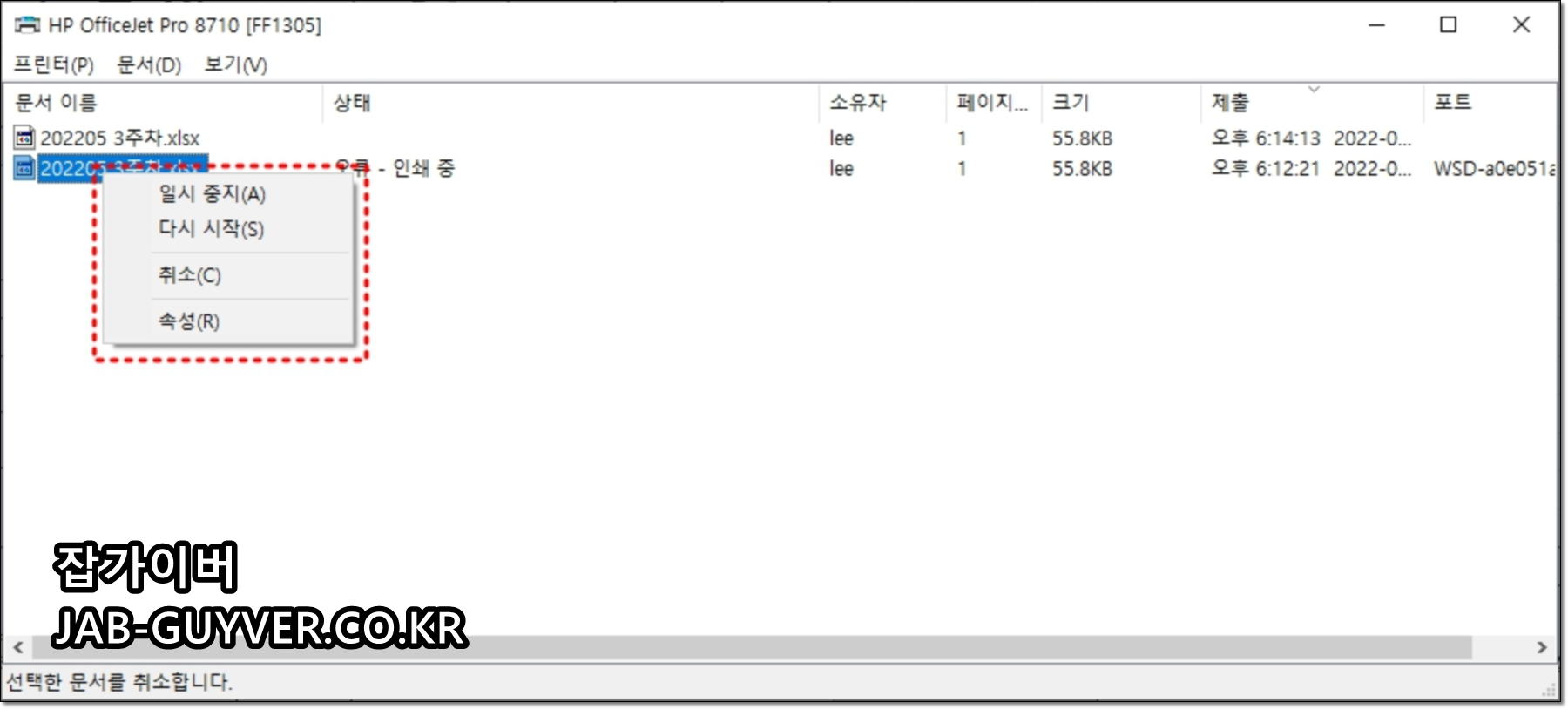 연결/전원은 정상인데도 인쇄가 안 되면, 대기열에 “깨진 작업”이 하나 걸려 전체를 막는 상황을 의심합니다. 아래처럼 인쇄 작업을 취소(삭제)합니다.