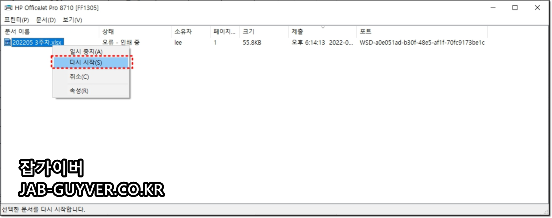 4) 대기열(스풀) 막힘 해결: 작업 삭제 → 다시 시작