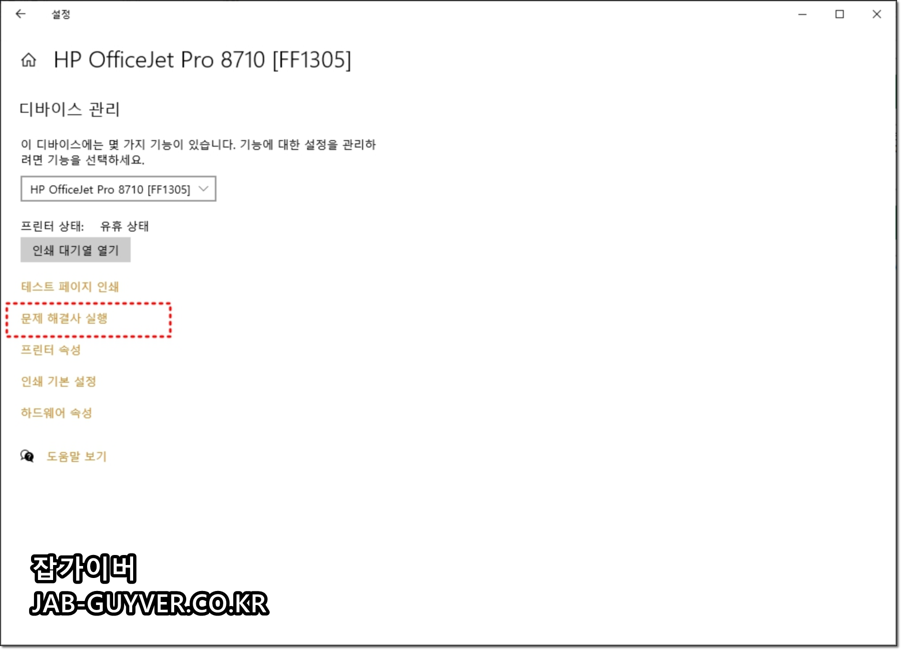 수동 조치 전에 가장 안전한 자동 복구 루트입니다. 스풀러/포트/오프라인/구성 문제를 윈도우가 진단해서 복구합니다.