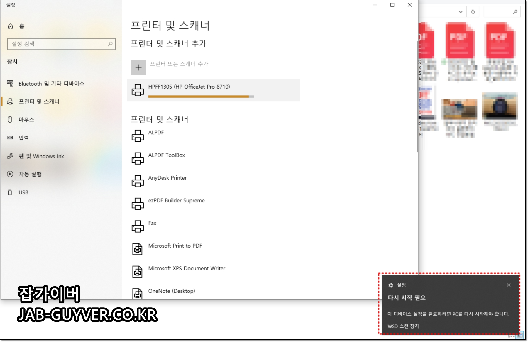 - 프린터 삭제 → 재부팅 → 다시 추가