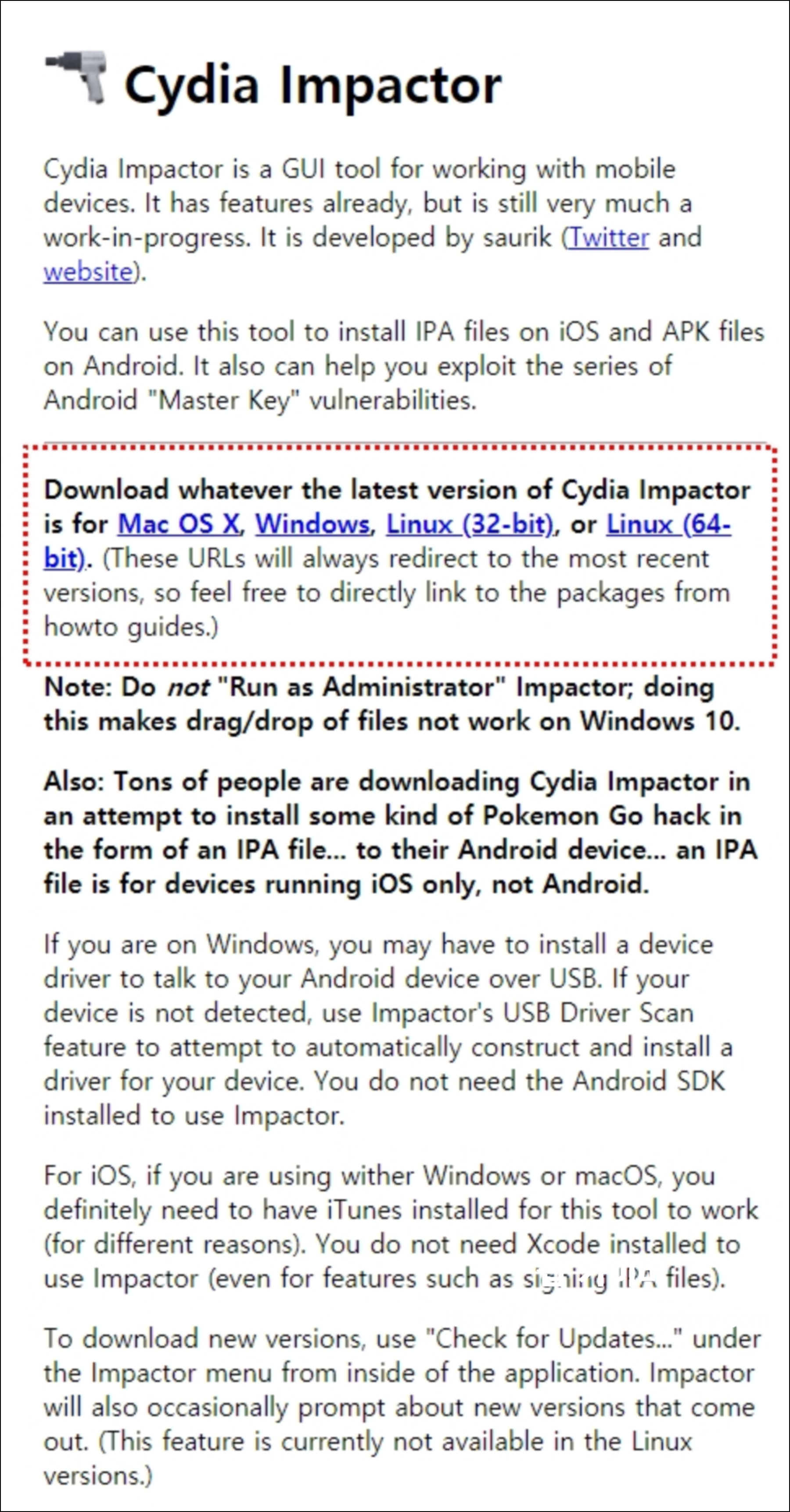 Cydia Impactor의 최신 버전을 Mac OS X , Windows , Linux (32 비트) 또는 Linux (64 비트) 용으로 다운로드하십시오 . (이 URL은 항상 최신 버전으로 리디렉션되므로 하우투 가이드에서 패키지로 직접 연결하십시오.)
