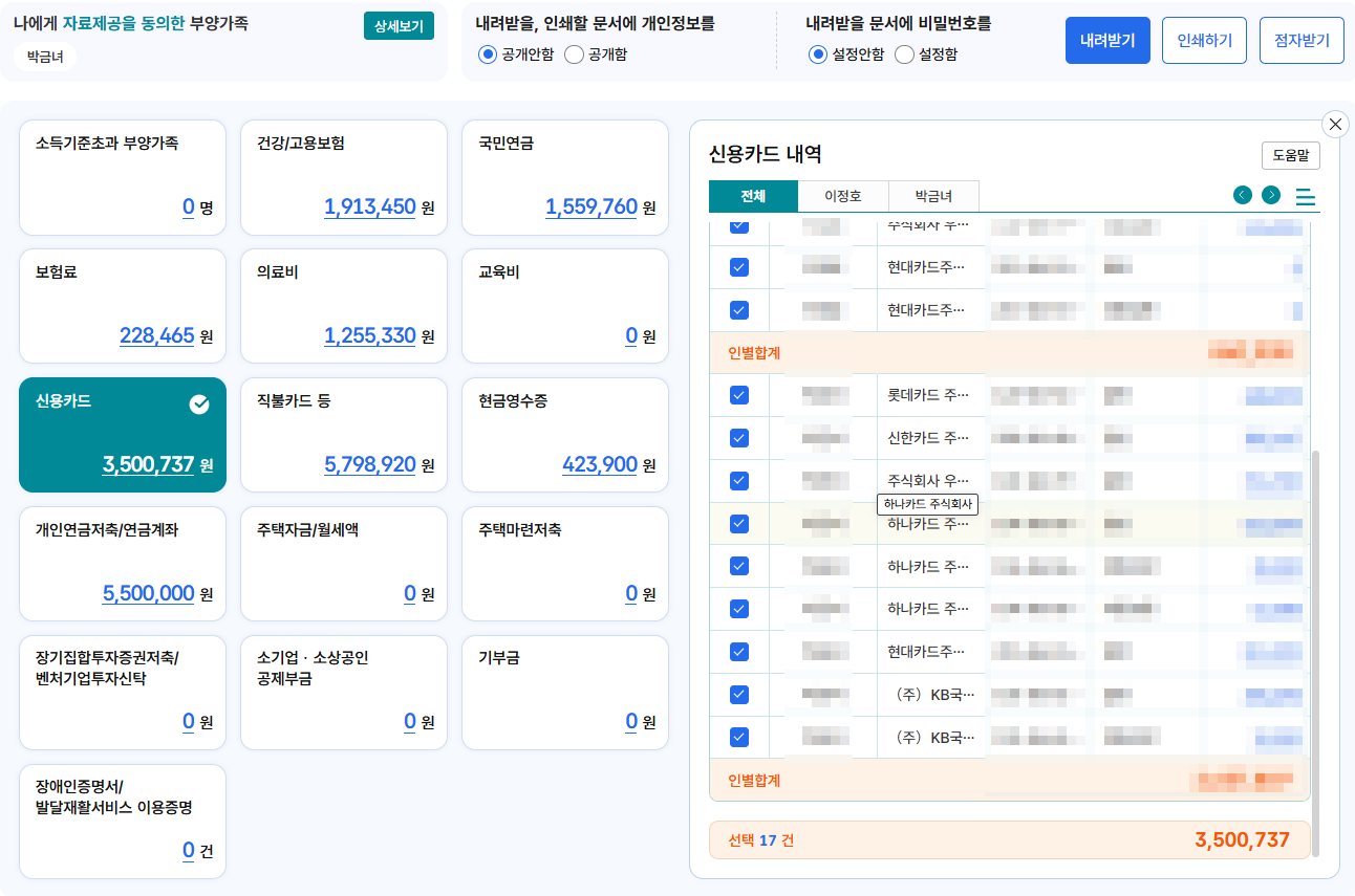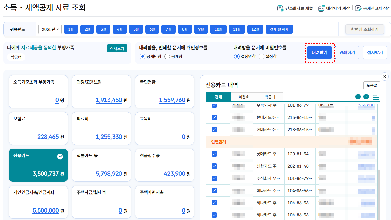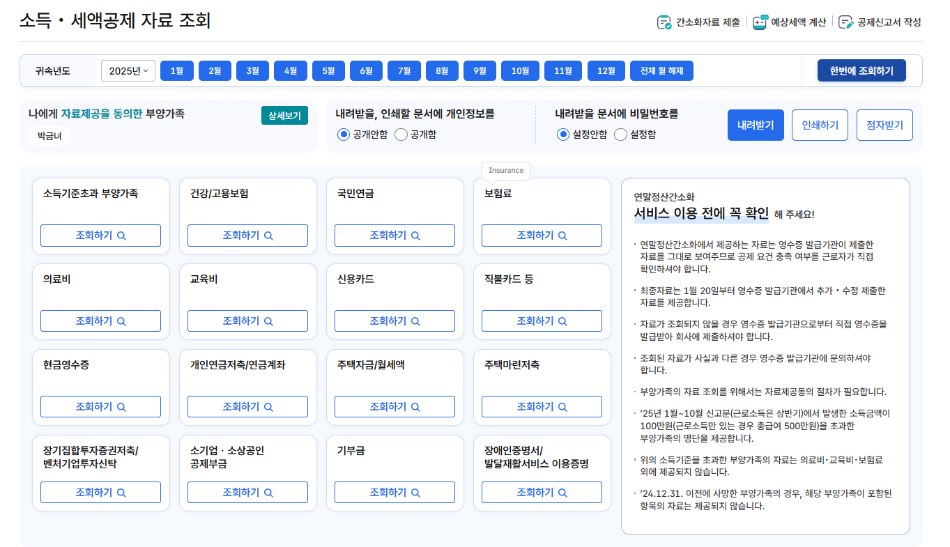A. 연말정산 공제 자료는 가족관계/공제 대상 여부에 따라 조회·반영 범위가 달라집니다. 홈택스에서 조회되는 항목을 기준으로 보고, 누락이 의심되면 해당 카드사 앱/웹에서 추가로 확인하는 게 빠릅니다.