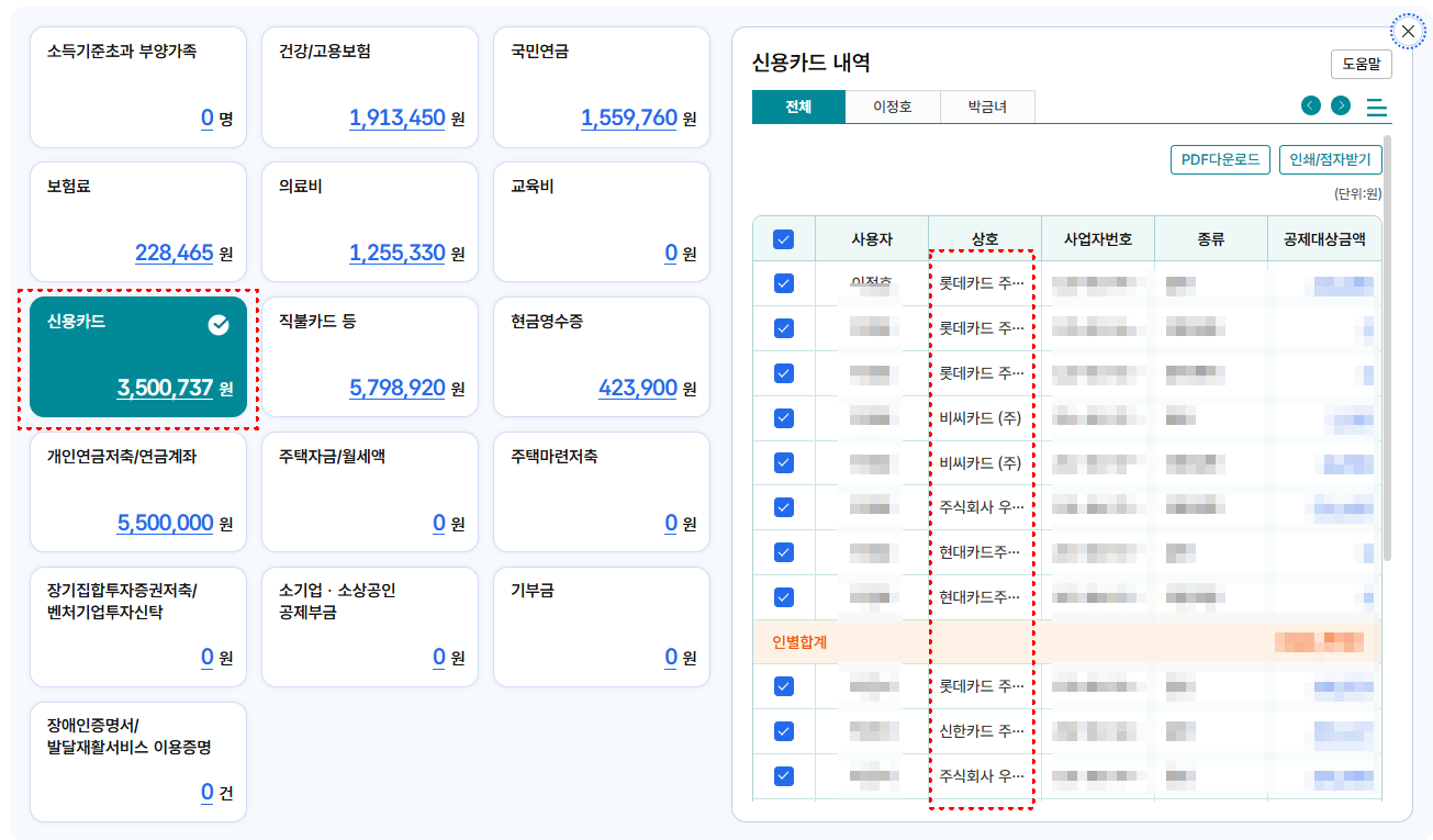 홈택스 신용카드 사용내역 PDF 저장·인쇄 출력 방법
