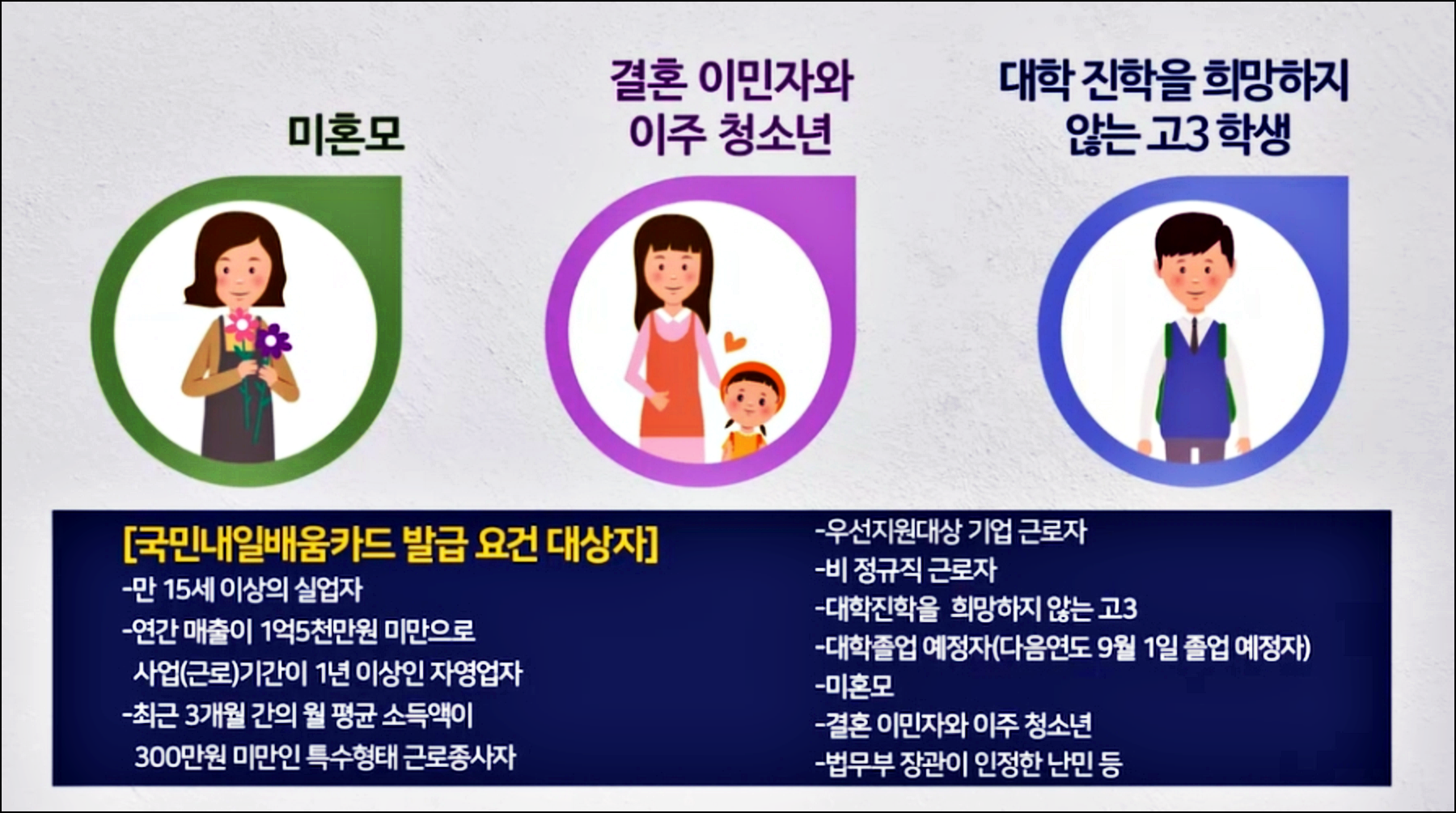 기존에 실업자와 재직자 대상의 내일배움카드가 지업훈련을 희망하는 모든 국민으로 국민내일배움카드로 변했습니다.