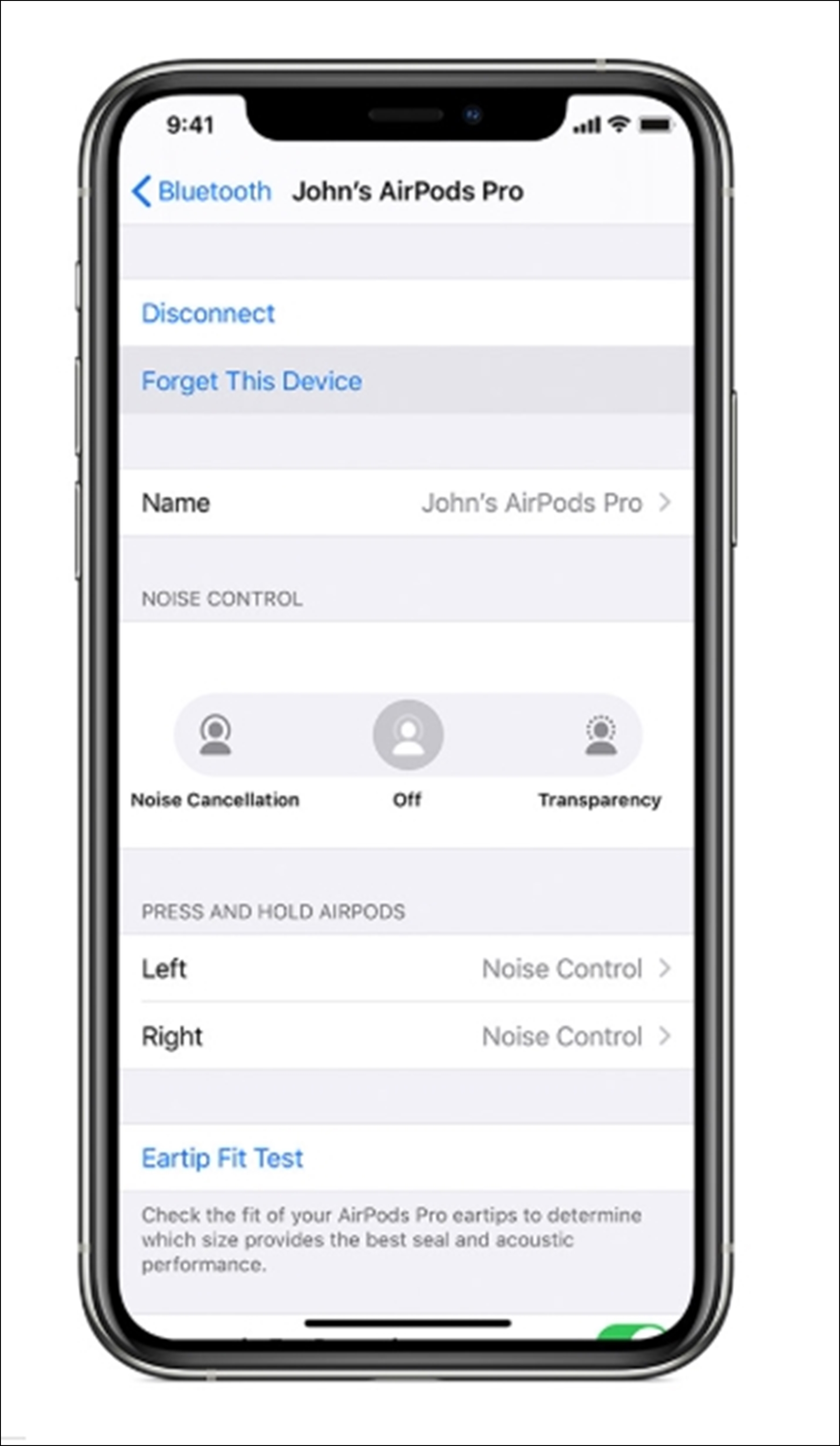 - 목록에서 내 에어팟 프로 오른쪽 ‘i’ 버튼 탭