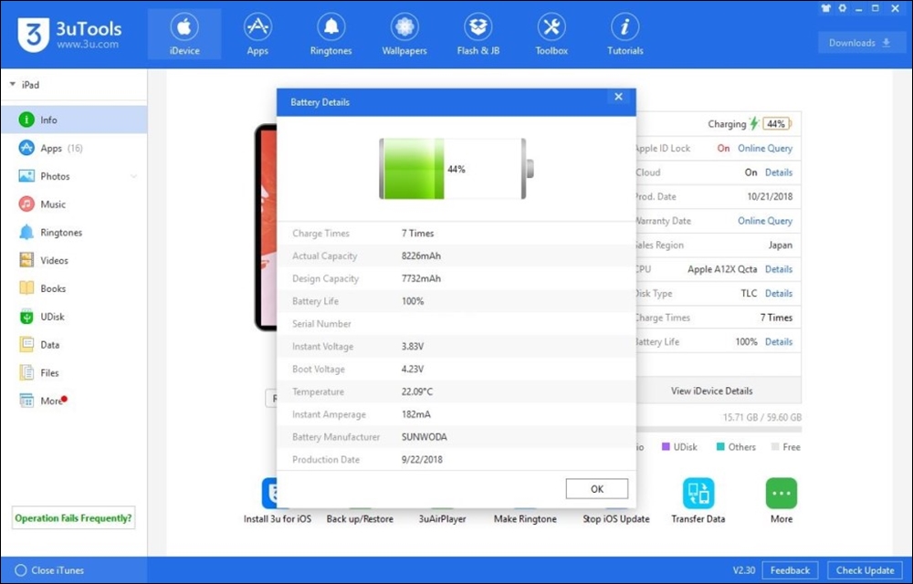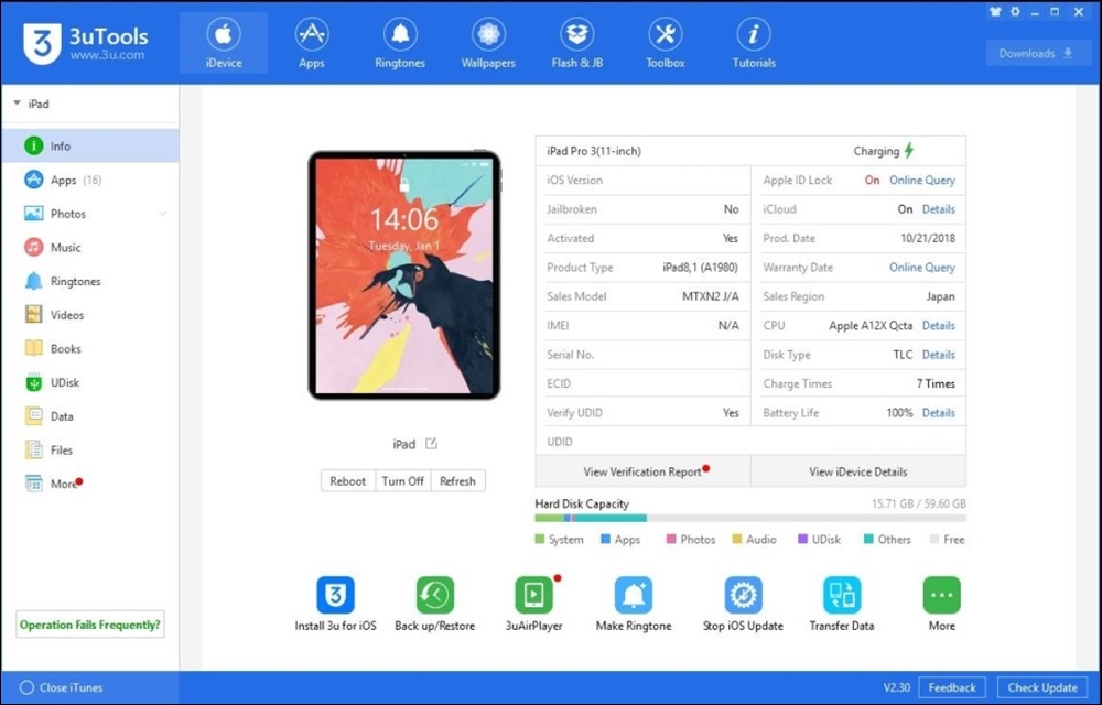아이폰/아이패드를 케이블로 연결한 다음 3uTools를 실행하면, 기기명·iOS 버전·모델·시리얼·저장공간 같은 정보가 한 화면에 정리됩니다.