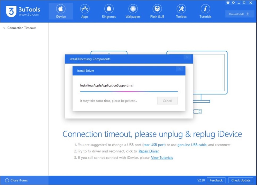 처음 실행하면 아이폰/아이패드와 연결하기 위해 Apple 드라이버가 필요하다는 안내가 뜹니다. 여기서 “아이튠즈까지 전부” 설치해도 되지만, 아이튠즈가 부담이라면 Install Driver를 눌러 드라이버만 잡는 방식으로도 연결이 됩니다.