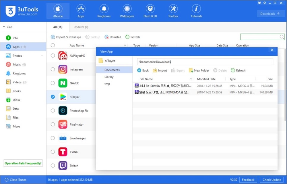 왼쪽 메뉴에서는 앱 목록(APP) 정리, 삭제 같은 관리도 가능하고, View 쪽으로 들어가면 기기 안에 저장된 항목을 눈으로 확인할 수 있습니다. nPlayer처럼 영상 앱을 쓰는 분들은 “어디에 뭐가 들어갔는지” 찾는 데도 도움이 됩니다.