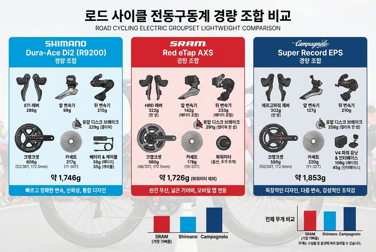 시마노 Di2, 스램 AXS, 캄파놀로 전동구동계 무게 비교 총정리