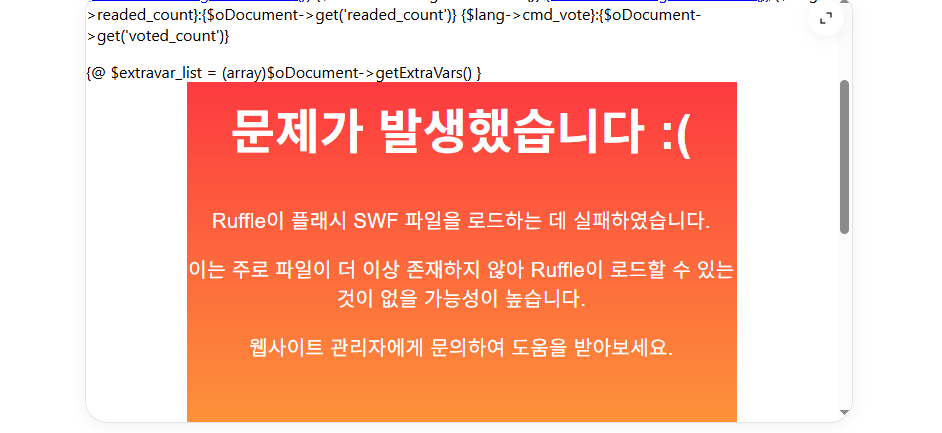 처음 뜬 오류는 스킨 템플릿 문제였고, 게시물 접속이 된 뒤에도 플래시가 안 보인 이유는 Flash Player 방식이 이미 막혀 있기 때문이었습니다. 따라서 read.html을 먼저 손보고, 그다음 Ruffle 방식으로 바꾸는 흐름이 맞았습니다.