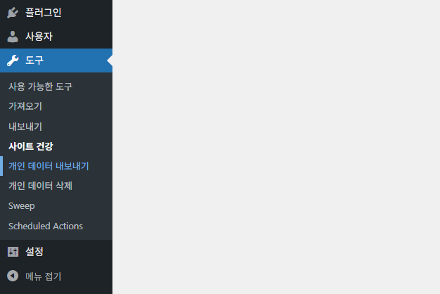 가장 먼저 들어가 볼 곳은 워드프레스 관리자 화면의 도구 > 사이트 건강입니다.