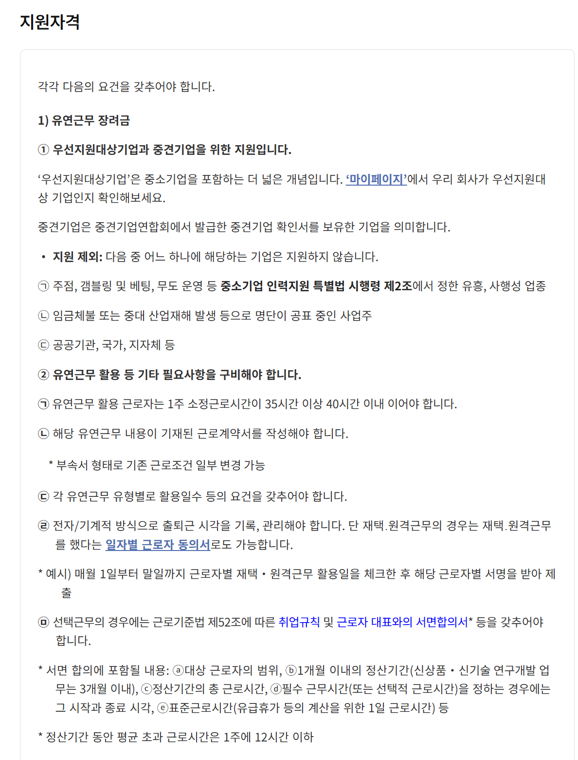마지막으로 정리하면 유연근무제 지원금 신청 전에 꼭 봐야 할 부분은 세 가지입니다.