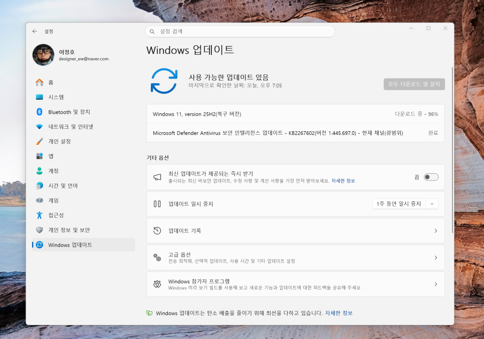 이런 증상이 생기면 보통 가장 먼저 윈도우 업데이트를 확인하게 됩니다. 저도 같은 생각으로 업데이트가 있는지 확인했고, 설치하면 해결될까 싶어 바로 진행했습니다. 그런데 결과는 같았습니다.