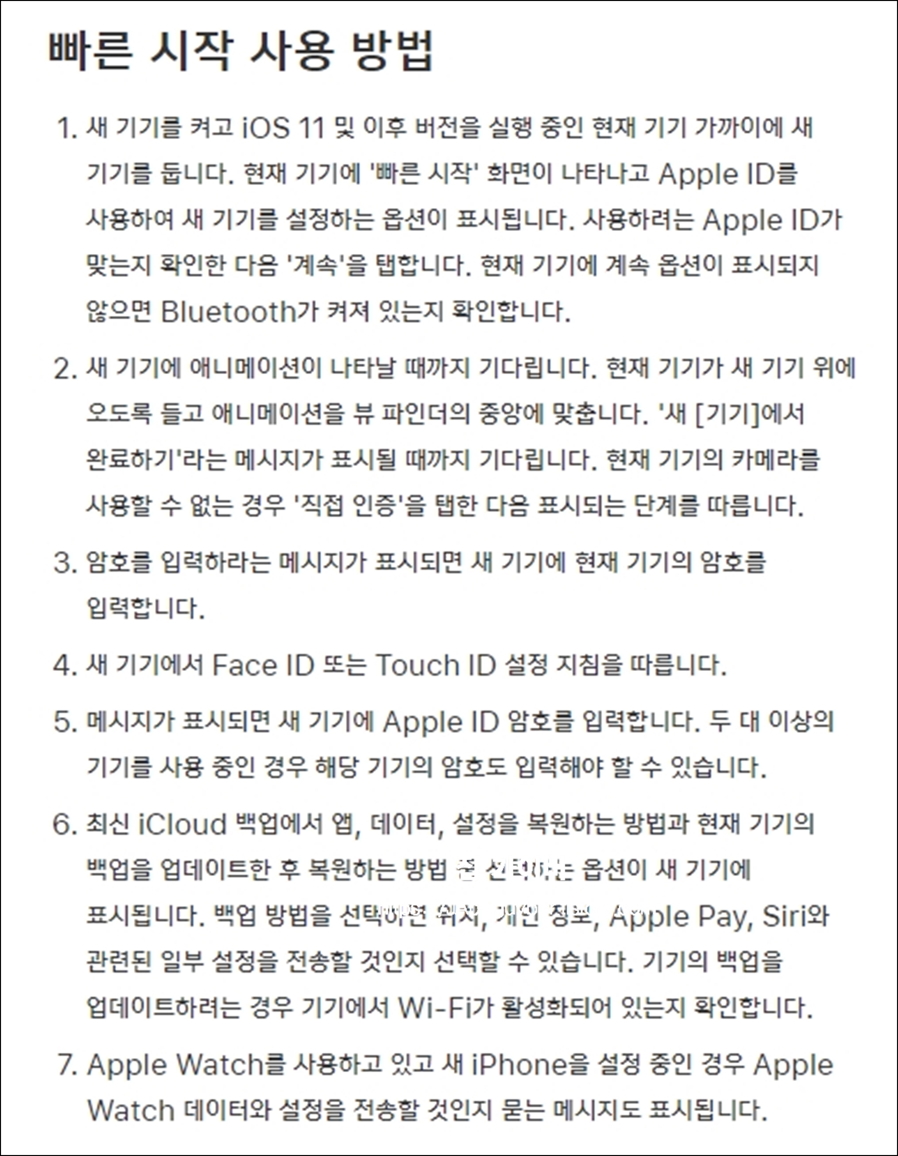- 새로운 아이폰11 기기를 실행 후 IOS11 이후 버전의 경우 핸드폰에 가까이 두게 되면 빠른시작 화면이 실행되며 애플 아이를 사용하여 새로운 기기를 설정하는 옵션이 표시된 다음 마이그레이션이 진행할 수 있습니다.