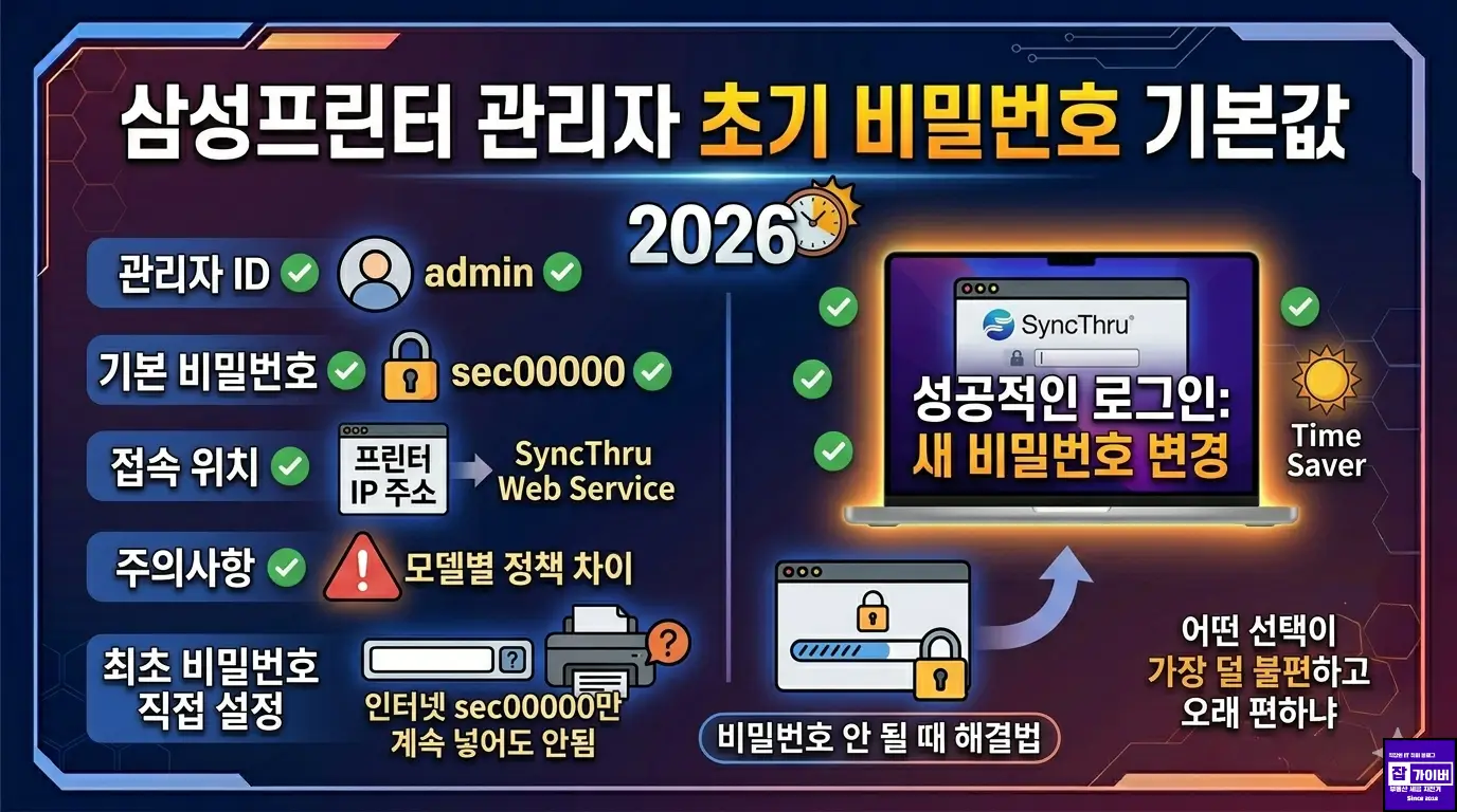 삼성프린터 관리자 초기 비밀번호를 찾을 때 가장 많이 확인하는 값은 admin / sec00000입니다. 다만 여기서 바로 끝내면 오히려 로그인 실패로 더 헷갈릴 수 있습니다. 2026년 기준으로 보면 삼성프린터 웹 관리자 페이지인 SyncThru Web Service는 모델에 따라 초기 비밀번호 정책이 다를 수 있고, 이미 누군가 비밀번호를 바꿔둔 장비도 많기 때문입니다.
