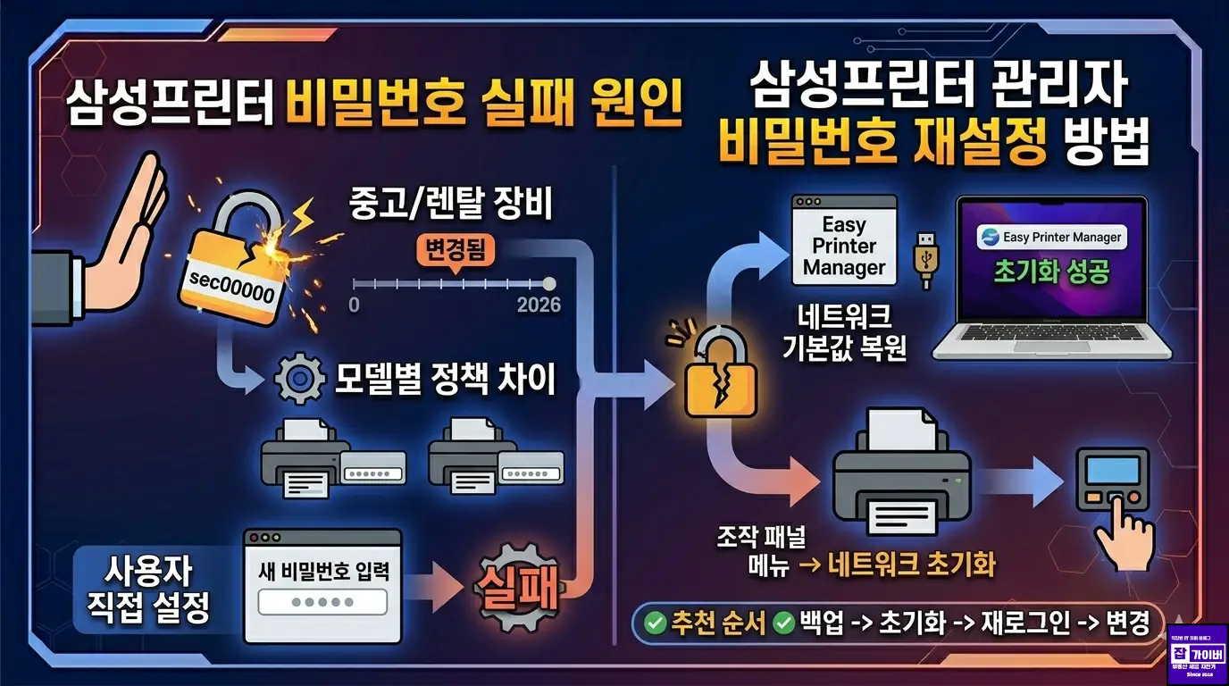 삼성프린터 관리자 비밀번호가 안 될 때는 단순히 “기본값이 틀렸다”기보다 이미 누군가 바꿔둔 상태인 경우가 더 많습니다.