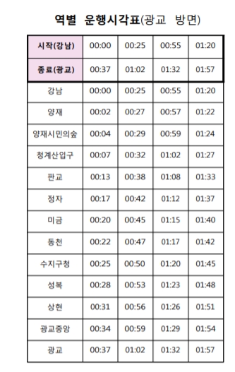| 양재 | 00 : 25 | 00 : 55 | 01 : 25 | 01 : 55 |