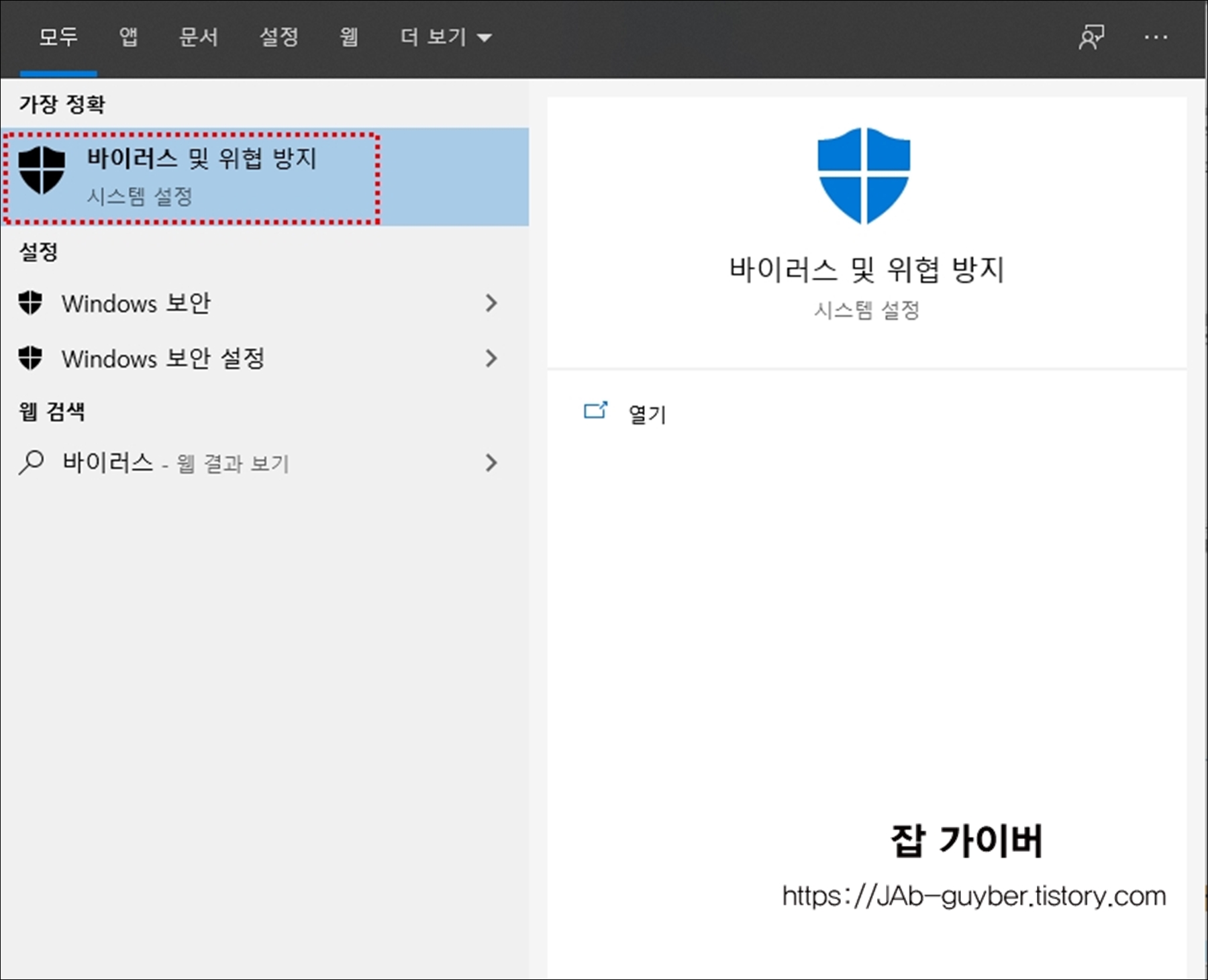 먼저, 윈도우10 작업 표시줄의 검색 상자에 '바이러스 및 위협 보호 설정' 또는 '윈도우 디펜더 보안 센터'를 입력하고 해당 설정을 엽니다.