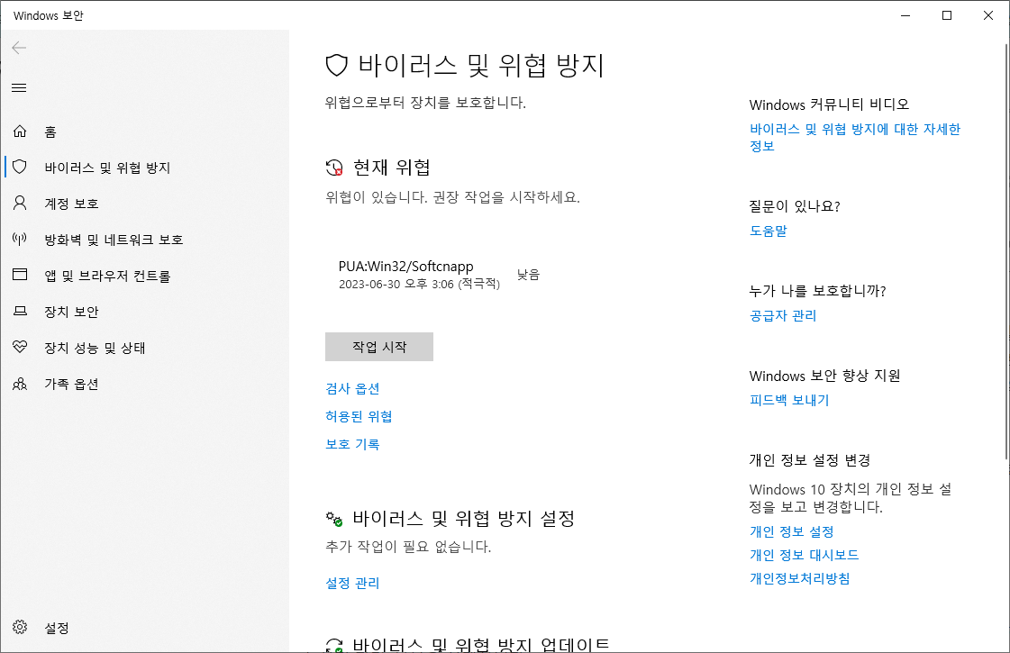 | 보안 센터 열기 | Windows 보안 > 바이러스 및 위협 방지 | Windows 보안 > 바이러스 및 위협 방지 |