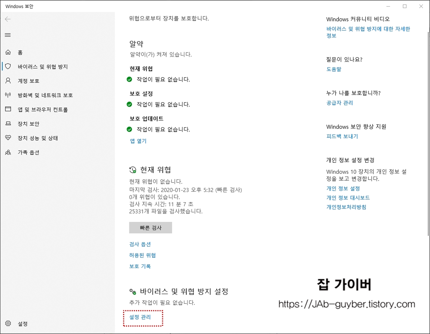 이 설정을 열면 현재의 보호 상태 및 최신 보안 업데이트를 확인할 수 있습니다. 여기서 마우스를 이용하여 스크롤을 내려 '설정 관리' 부분을 선택합니다.