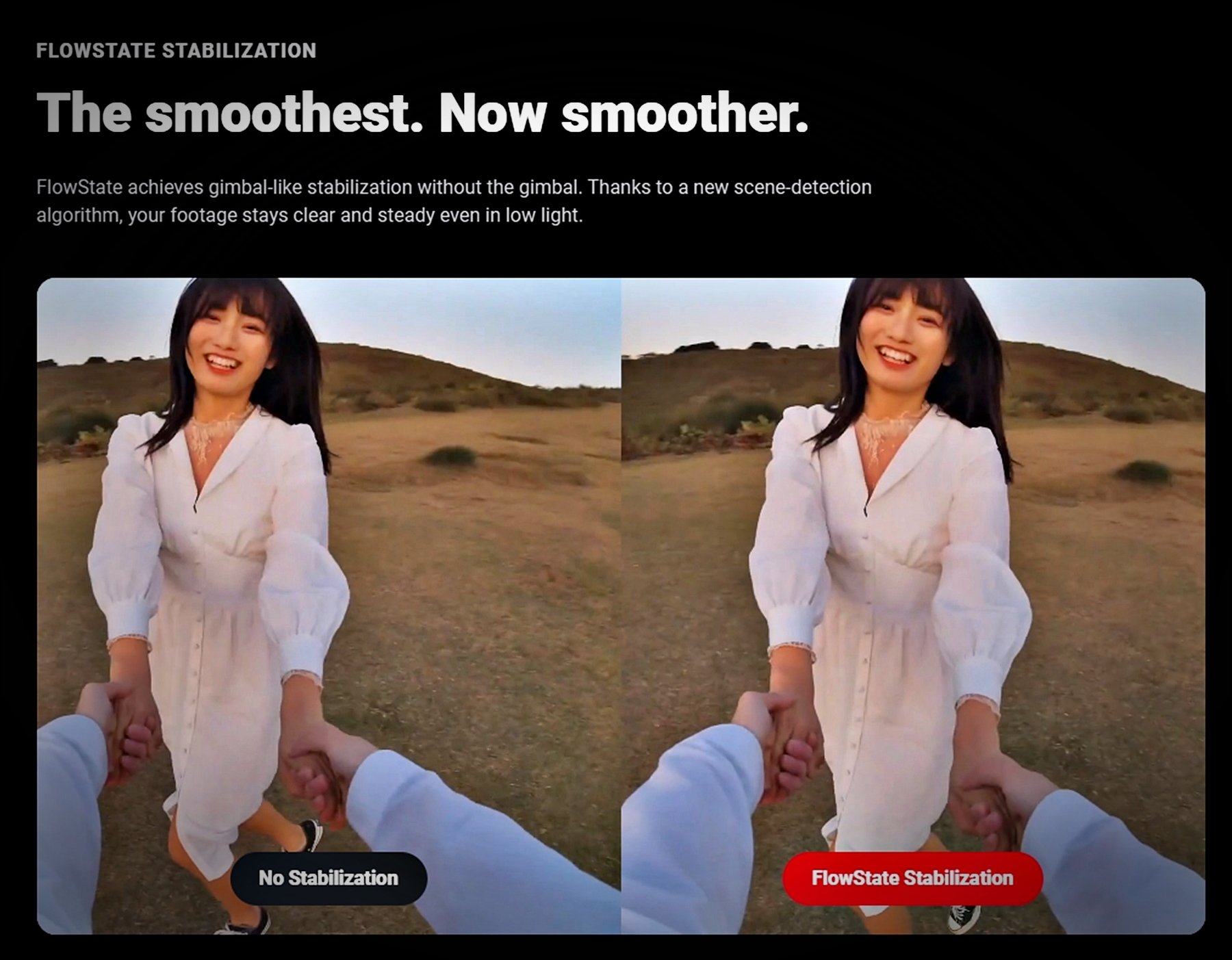 FlowState는 짐벌이 없더라도 더욱 부드러운 영상을 촬영할 수 잇또록 안정화가 가능하며 어두운 저조도 환경속에서도 1인치 센서를 통해 실내나 어두운 밤에서 선명한 색상을 제공합니다.