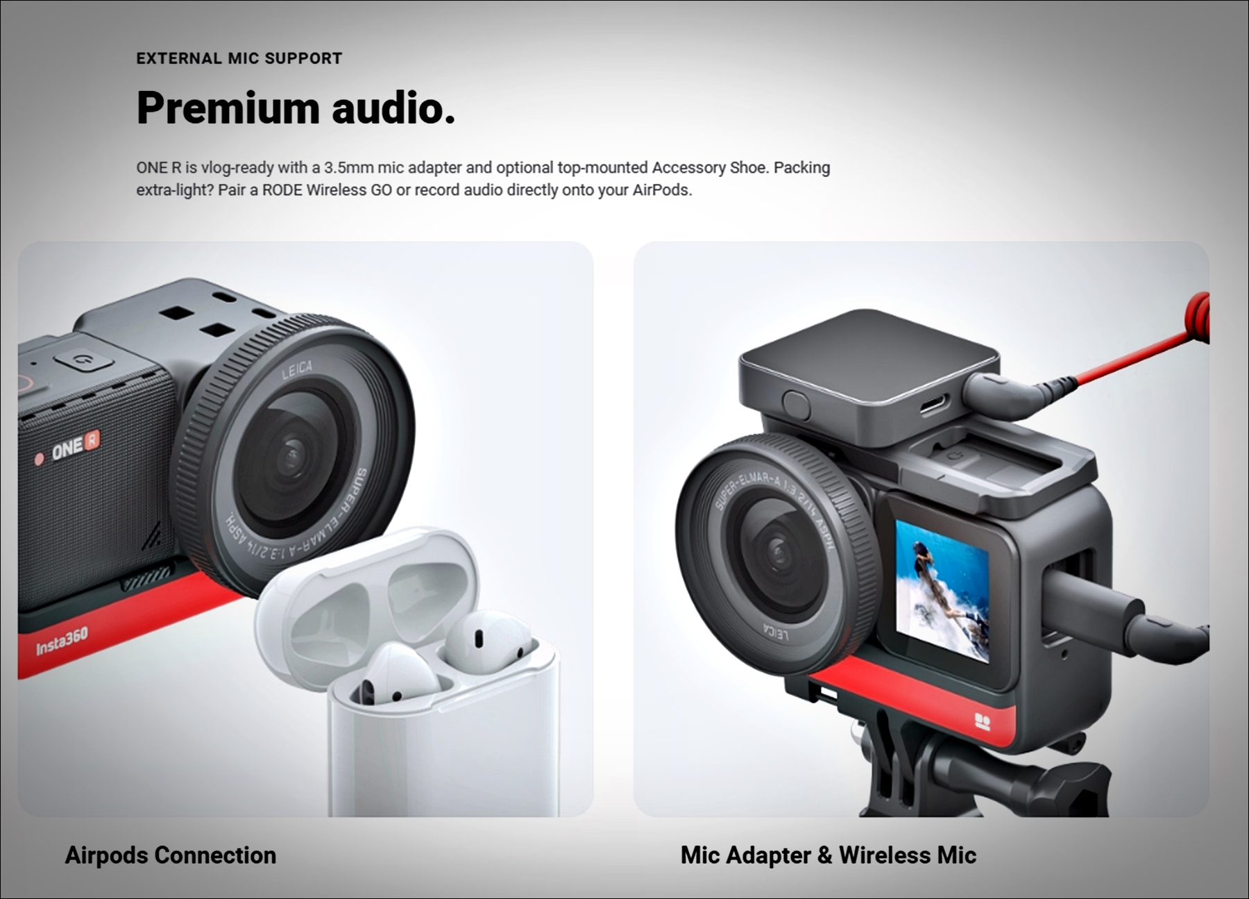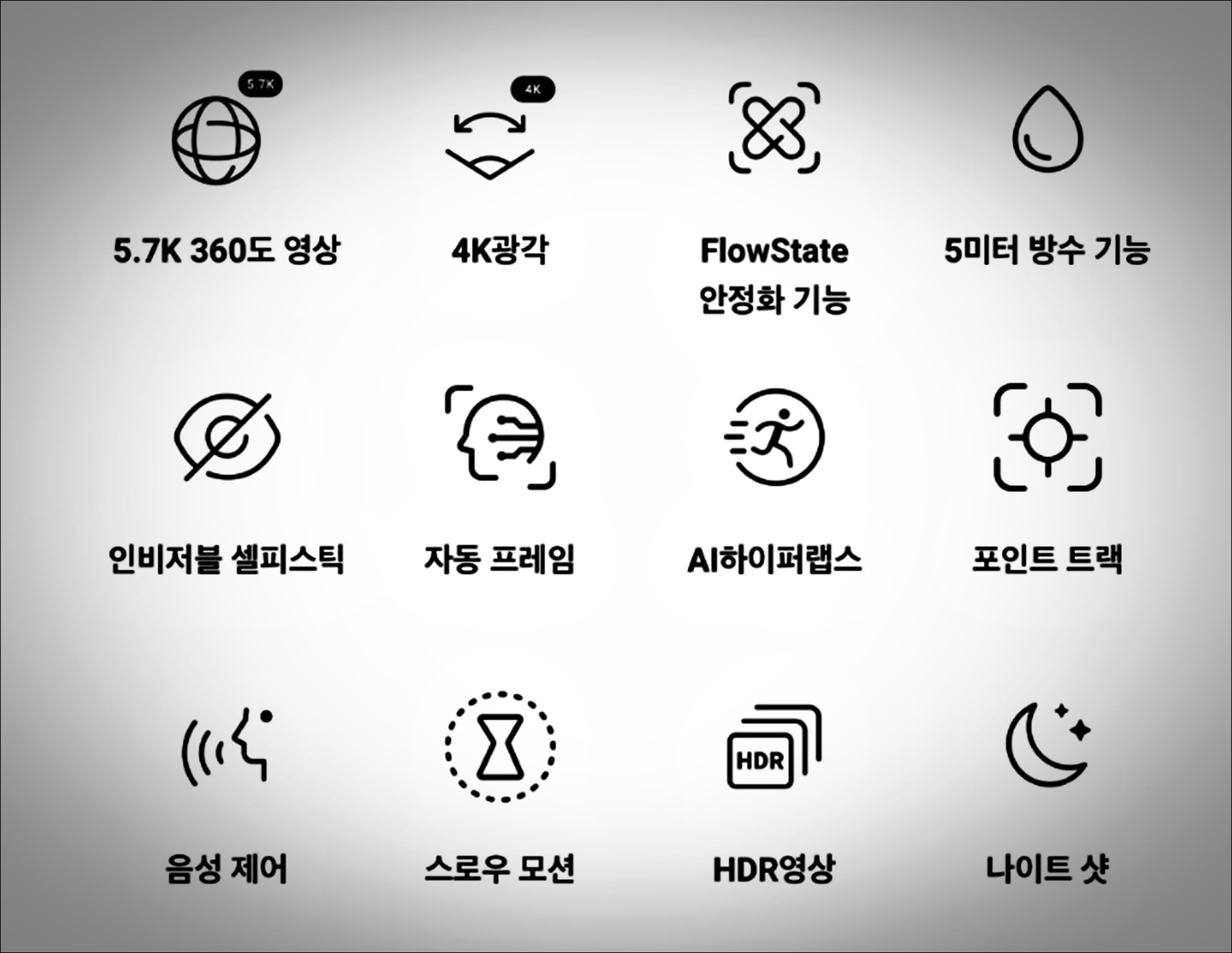 | Insta360 X3 | 5.7K 30fps | 1/2" | IPX8 | 향상된 저조도 성능, 더 큰 터치스크린 |