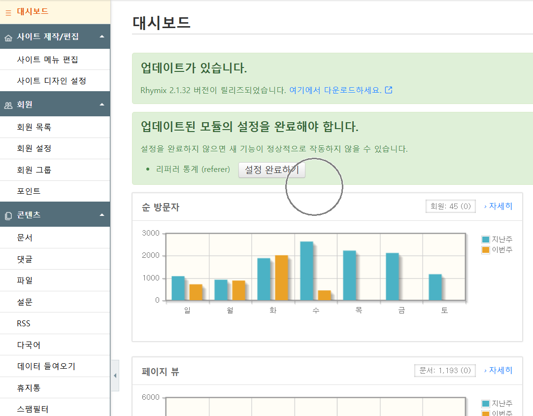 라이믹스 업데이트 직후에는 관리자 설정, referer 관련 화면, counter 관련 화면, 통계성 화면, 일부 애드온 설정 페이지처럼 새 템플릿을 다시 컴파일해야 하는 화면에서 문제가 먼저 드러납니다.