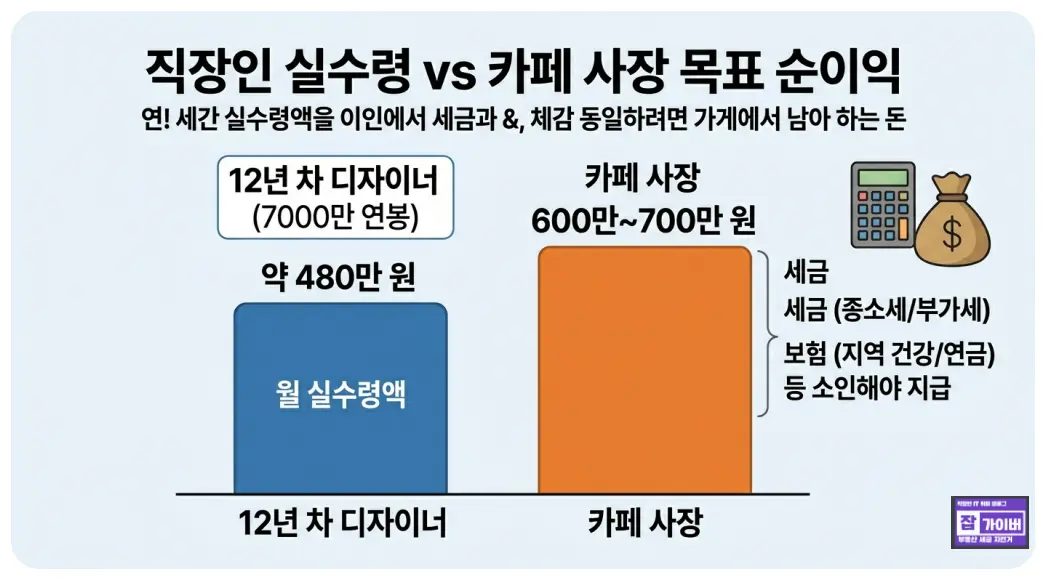 연봉 7000만 원 직장인이 월 480만 원 정도를 비교적 안정적으로 받고 있다고 가정하면, 카페 사장도 최소한 이 정도는 꾸준히 개인 통장으로 가져가야 “퇴사해서 내려온 게 아니라 옮겨간 것”이라고 말할 수 있습니다.