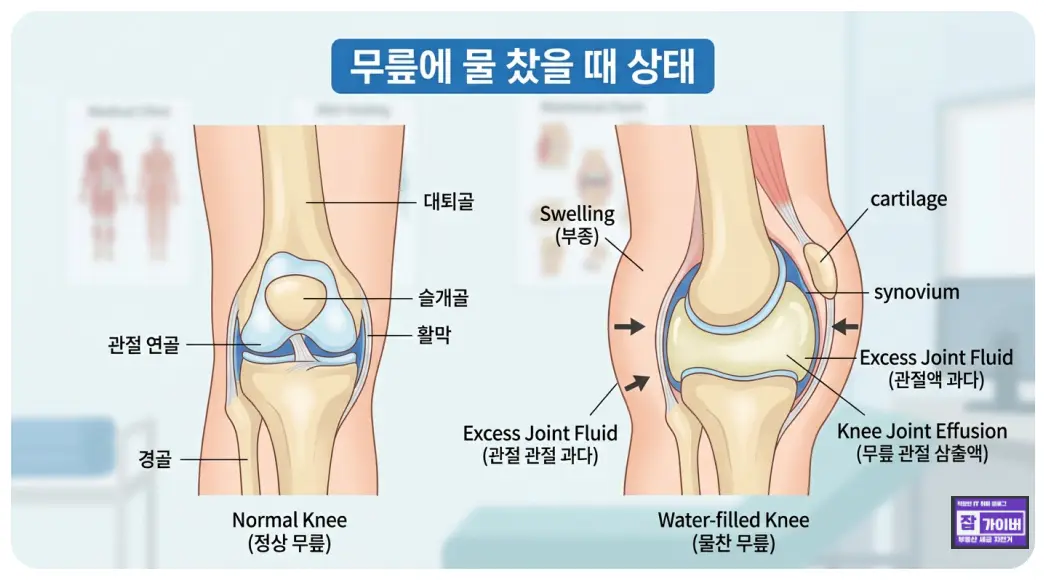많이들 말하는 무릎에 물이 찼다는 건 정말 물이 찬다기보다, 무릎 안이나 주변에서 염증이나 자극이 생겨 액체가 늘어난 상태로 보는 편이 더 맞습니다. 문제는 이게 한 번 생기면 그냥 며칠 쉰다고 끝나는 경우보다, 왜 아팠는지 모르고 다시 같은 운동을 반복해서 오래 가는 경우가 많다는 점입니다.