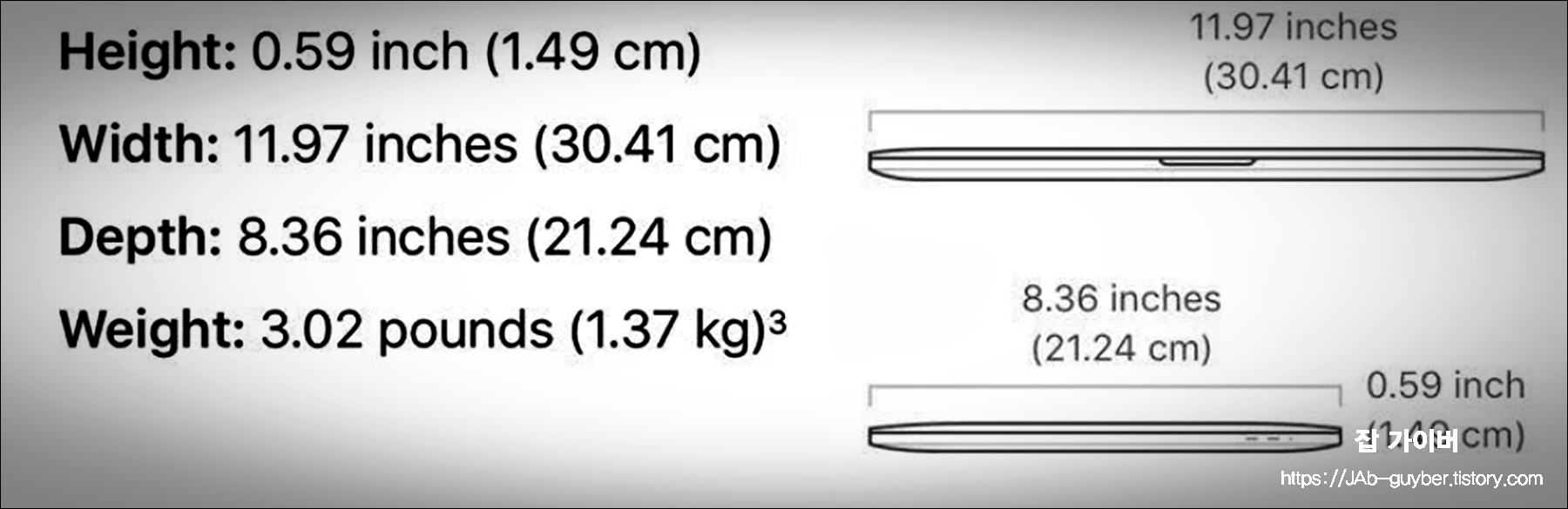 13 형 MacBook Pro의 길이는 11.97 인치, 너비는 8.36 인치, 두께는 14.9mm입니다. 무게는 3 파운드입니다.