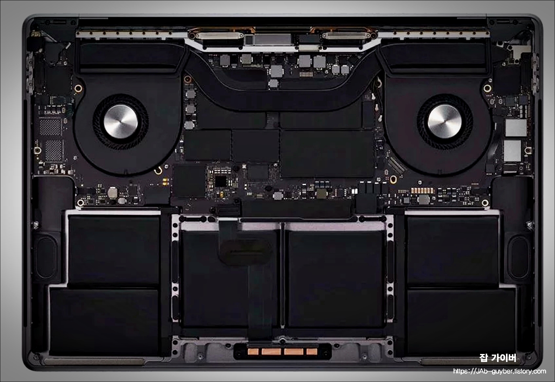 날이 길고 통풍구가 더 큰 임펠러가 장착된 새로운 팬 디자인으로 공기 흐름이 28 % 증가합니다. 방열판은 35 % 더 커져 이전보다 "상당히"더 많은 열 발산을 가능하게 하여 16 인치 MacBook Pro는 집중적인 운동 중에 이전 15 인치 MacBook Pro보다 최대 12 와트 더 많은 전력을 유지할 수 있습니다.