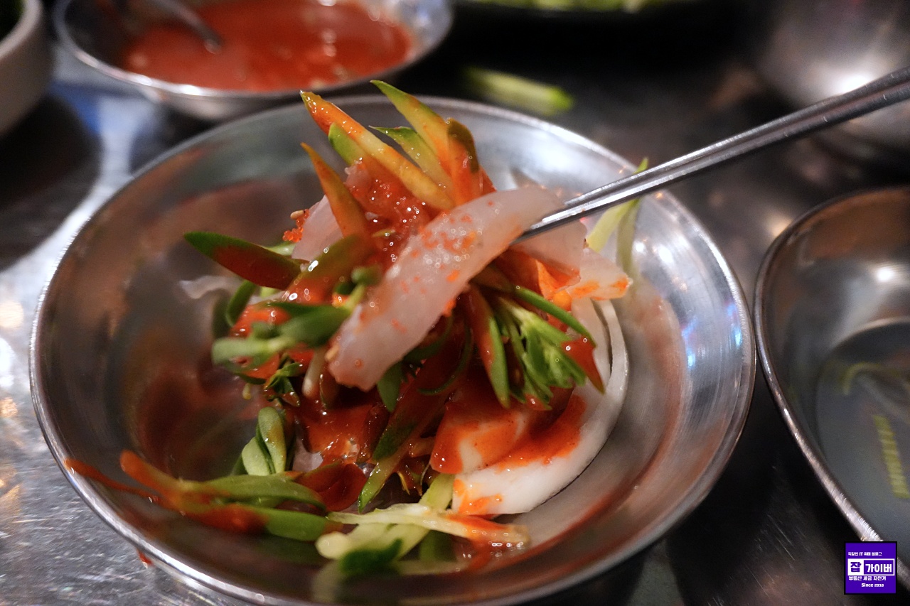 특제소스에 찍어 먹으면 매콤하면서도 감칠맛이 확 올라오고, 야채랑 같이 먹으면 식감이 더 풍성해집니다. 그냥 초장 맛만 강하게 밀어붙이는 스타일이 아니라, 회 자체의 신선함과 씹는 맛을 살려주는 소스라서 더 좋았어요. 한 점 먹고 나면 바로 다음 한 점이 생각나는 맛이라고 해야 할까요. 그래서 자연스럽게 소주잔도 자주 가게 됩니다.