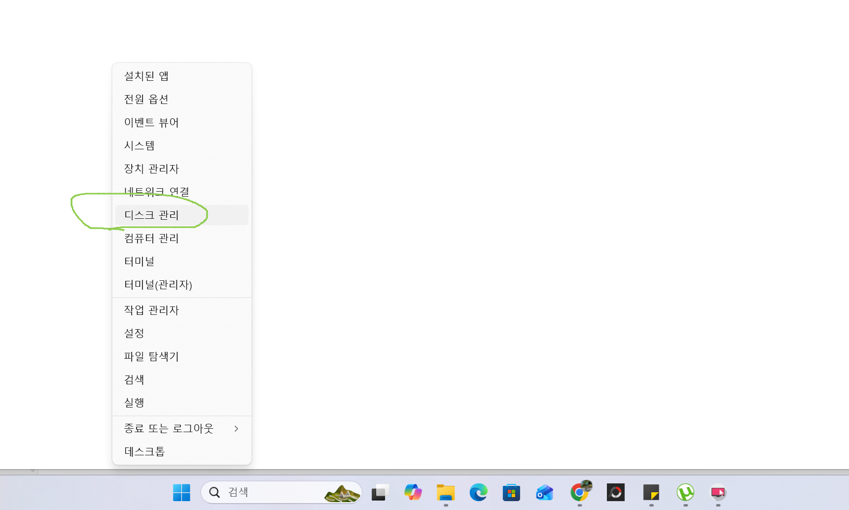 가장 먼저 시작 버튼 우클릭 → 디스크 관리로 들어갑니다.