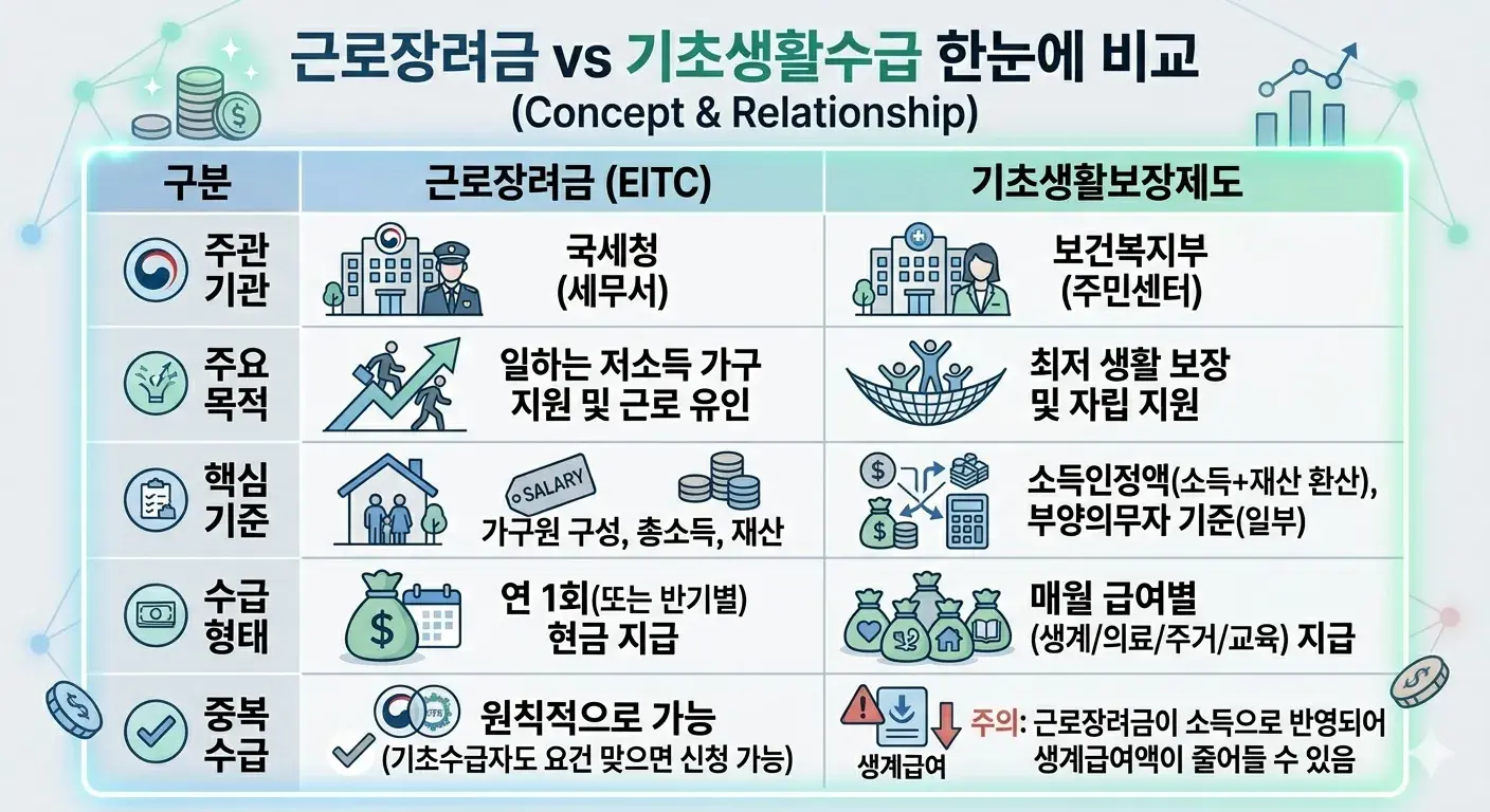 근로장려금과 기초생활수급자 급여는 둘 중 하나만 고르는 구조가 아닙니다.