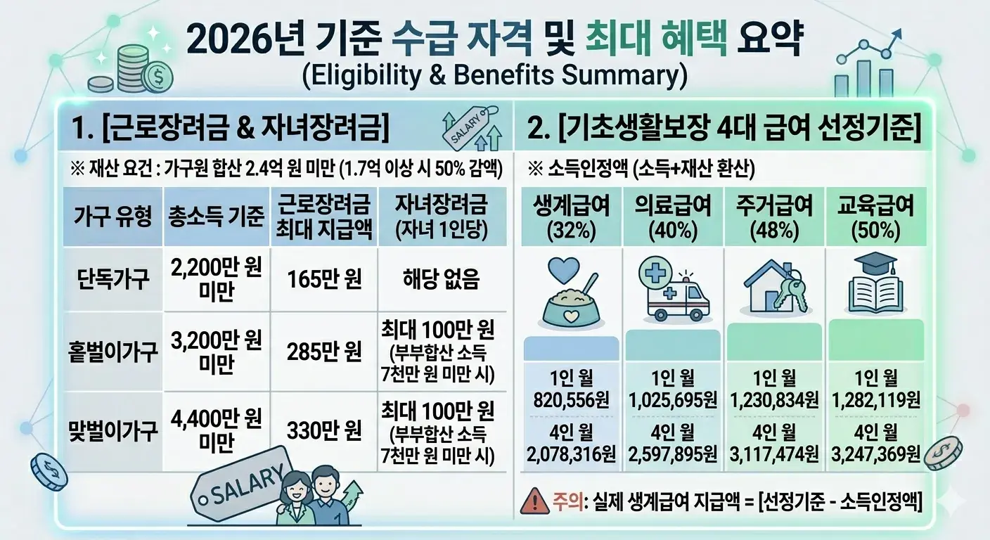 이 경우는 근로장려금과 자녀장려금이 훨씬 현실적인 도움이 됩니다. 수급은 안 되는데 소득은 넉넉하지 않은 집은 여기서 체감이 많이 납니다.