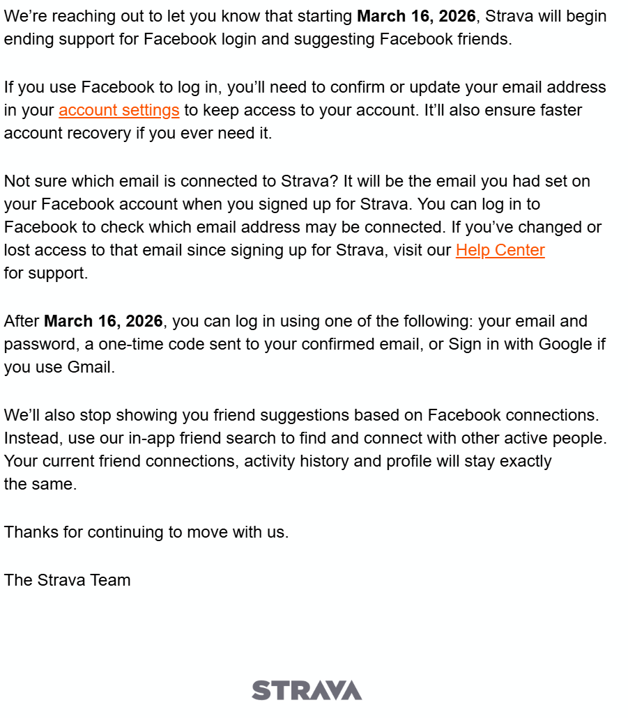 그런데 스트라바에서 2026년 3월 16일부터 페이스북 로그인 지원을 종료한다고 공지했습니다. 페이스북으로 스트라바에 가입했거나, 지금도 페이스북 버튼으로 로그인하던 분들은 계정 이메일을 반드시 확인해두는 게 좋습니다.