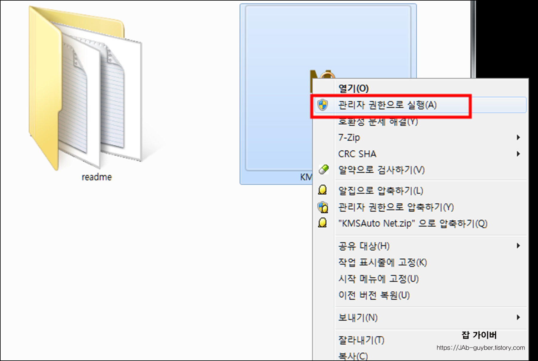 압축을 해제하면 KMSAuto Net.exe 파일과 readme 폴더가 있습니다.