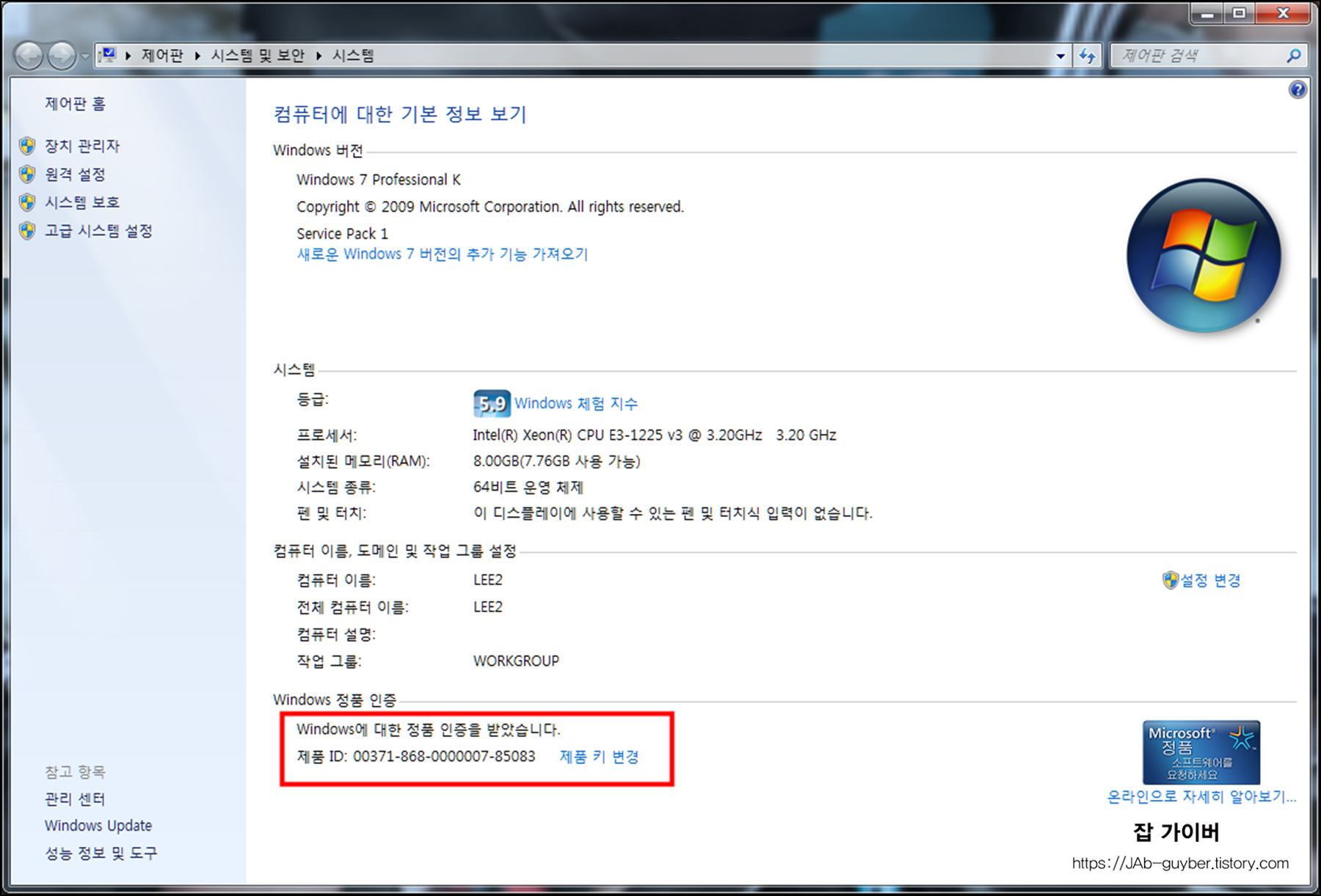 내PC - 속성을 눌러주면 하단에 Windows에 대한 정품 인증을 받았다는것을 확인할 수 있습니다.