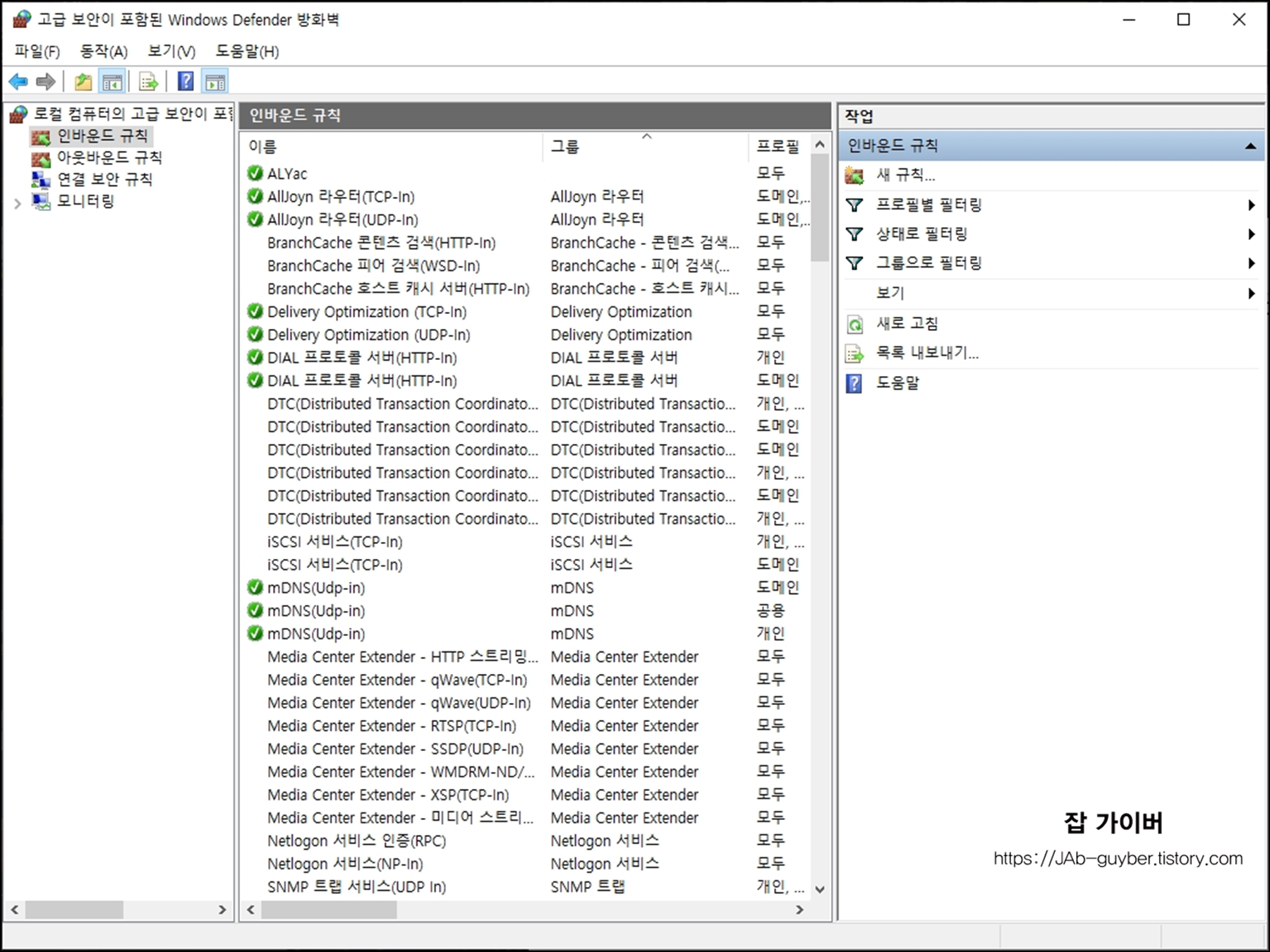- 인바운드 규칙 및 아웃바운드 규칙 관리: '인바운드 규칙' 및 '아웃바운드 규칙'을 관리할 수 있는 창이 열립니다.