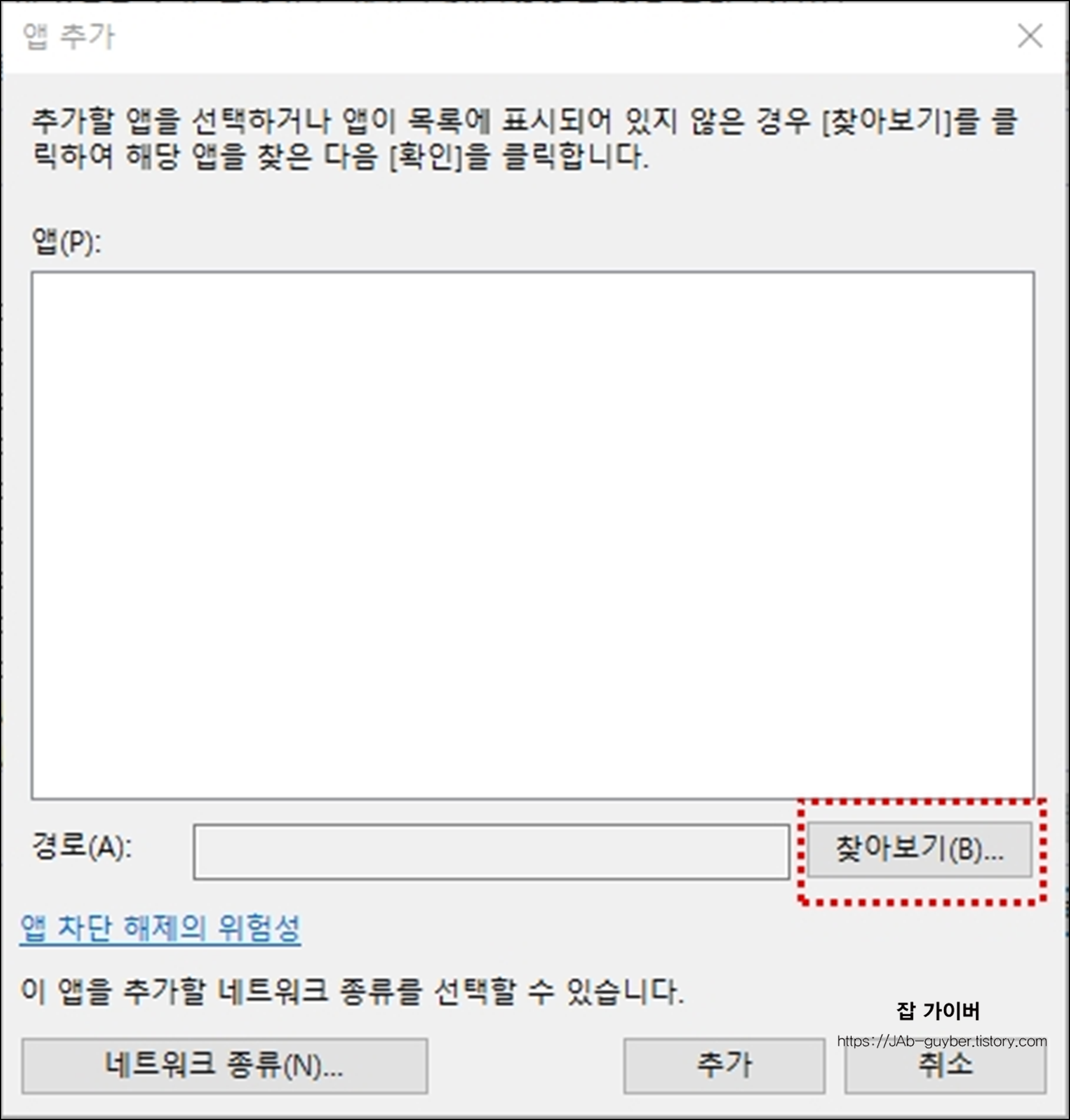 - 프로그램 선택: 규칙을 만들 때, 어떤 프로그램을 예외로 설정할 것인지 선택합니다. 프로그램의 실행 파일 경로를 지정해줍니다.