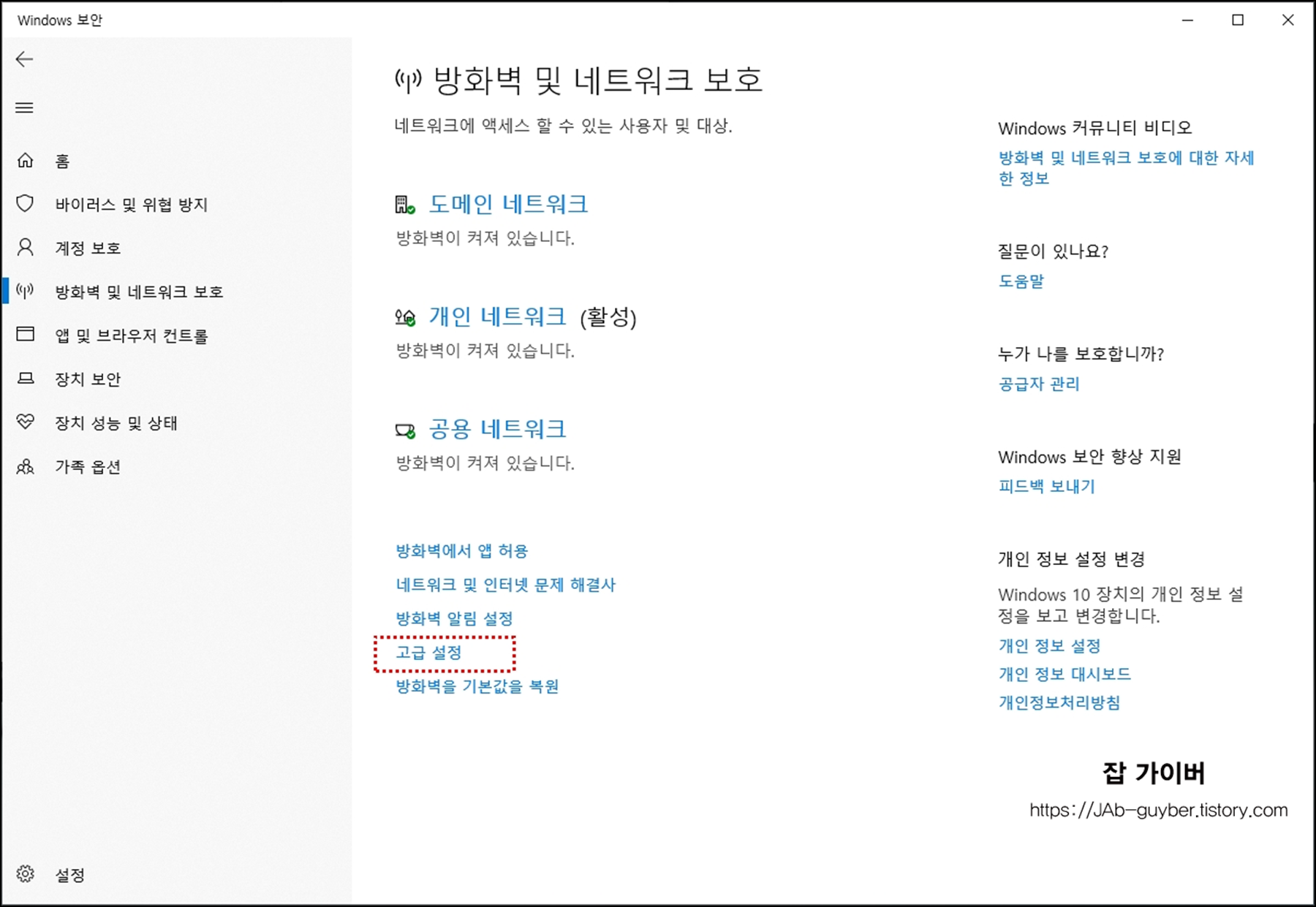 그외 개인 네트워크 및 공용네트워크 방화벽이 켜져있는지 확인할 수 있습니다.