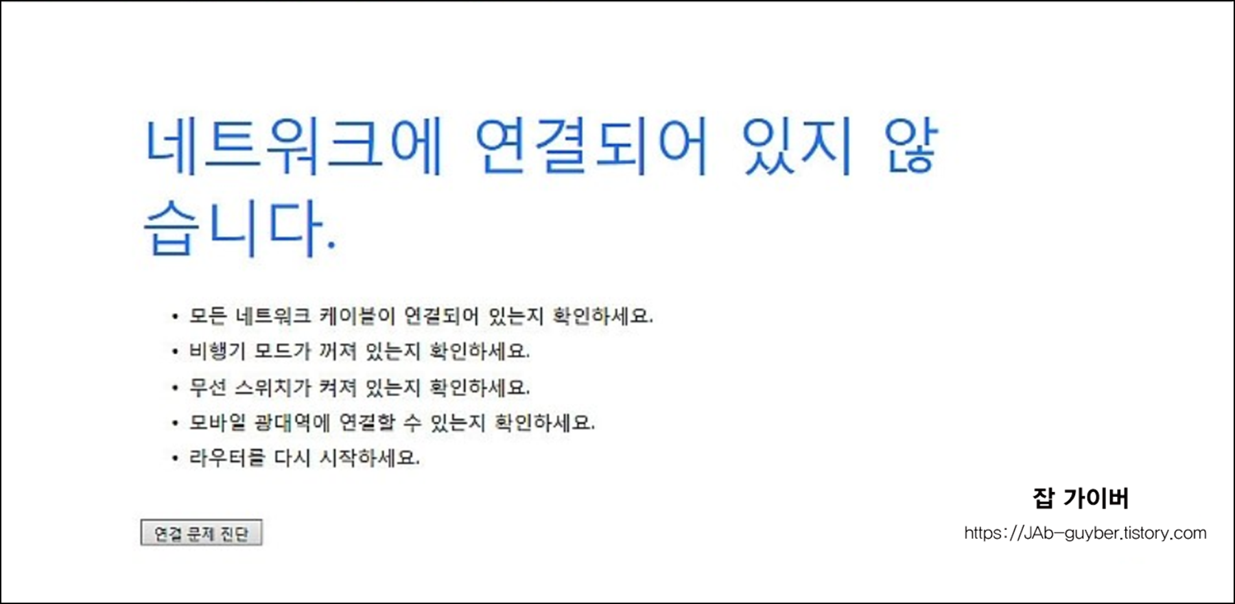 그럼 하단에 알림창에 인터넷 연결 안됨 - 연결할 수 없습니다. 알림을 확인합니다.