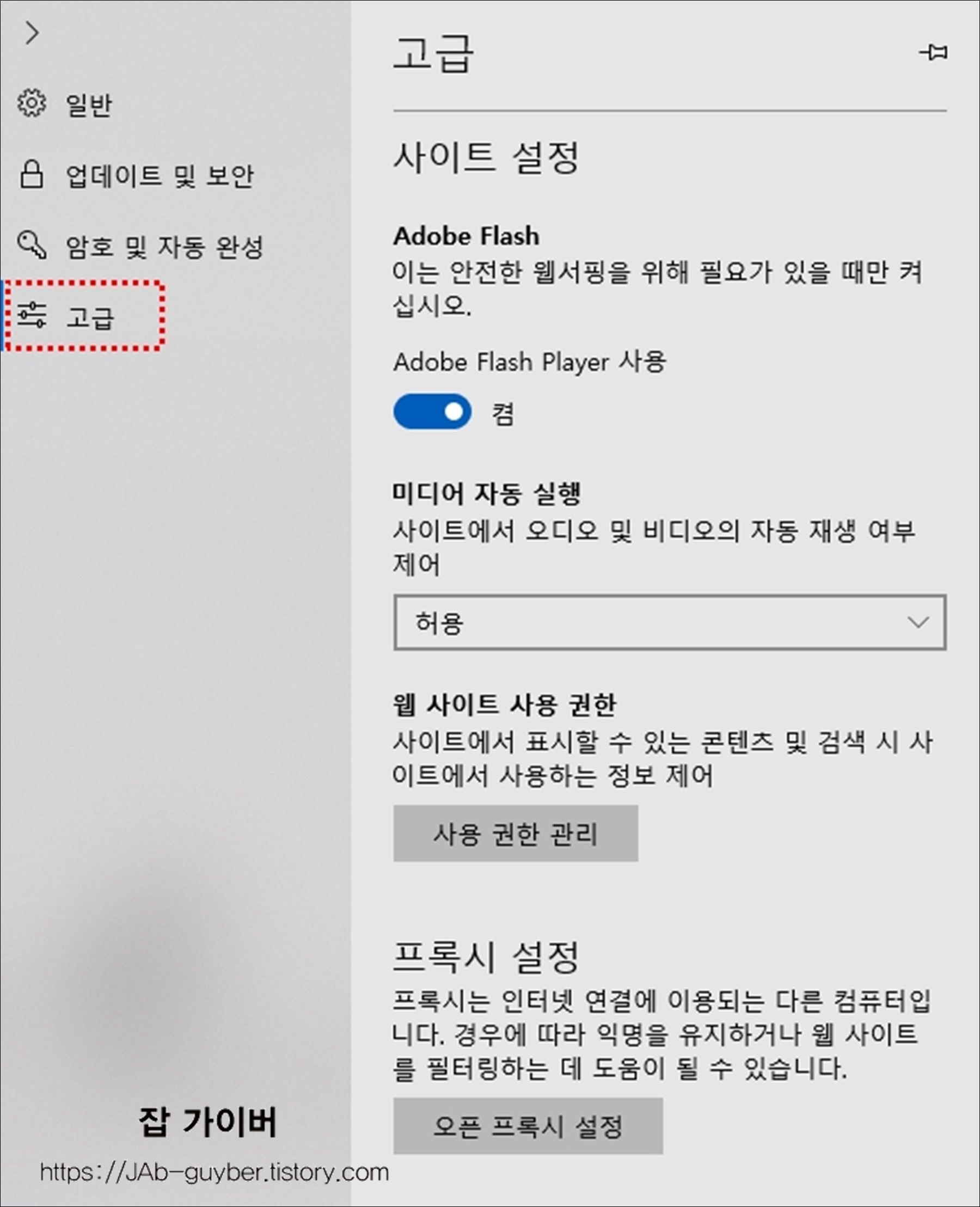 이 메뉴에서 '설정'을 선택합니다. 그런 다음, '고급' 탭을 찾아 클릭하면, 'Adobe Flash Player 사용' 옵션을 활성화할 수 있습니다.