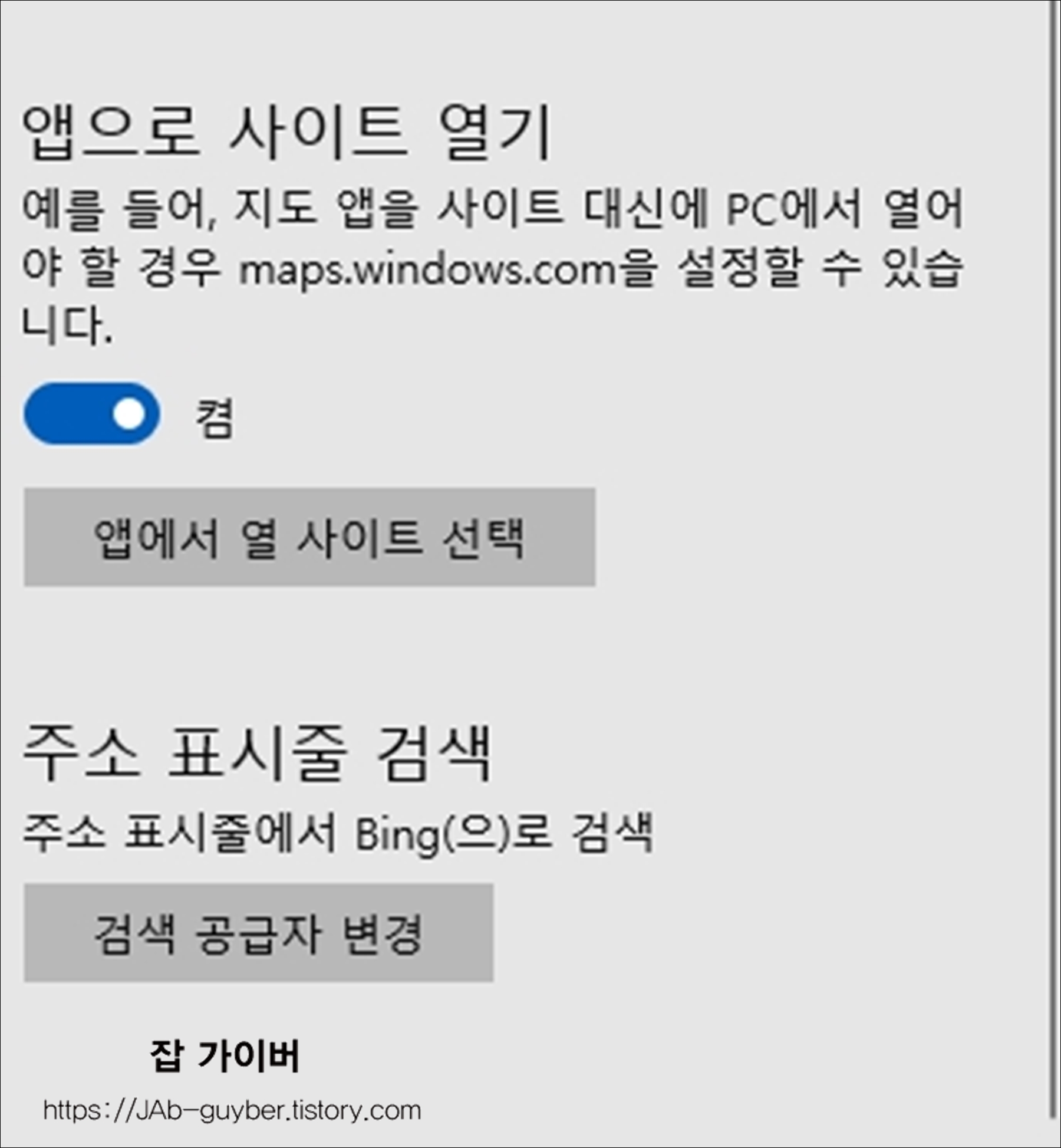 그 왜에도 앱에서 열 사이트를 선택하거나 검색 공급자를 기본 Bing에서 구글이나 네이버등으로 변경하기 원한다면 검색 공급자 변경을 선택합니다.