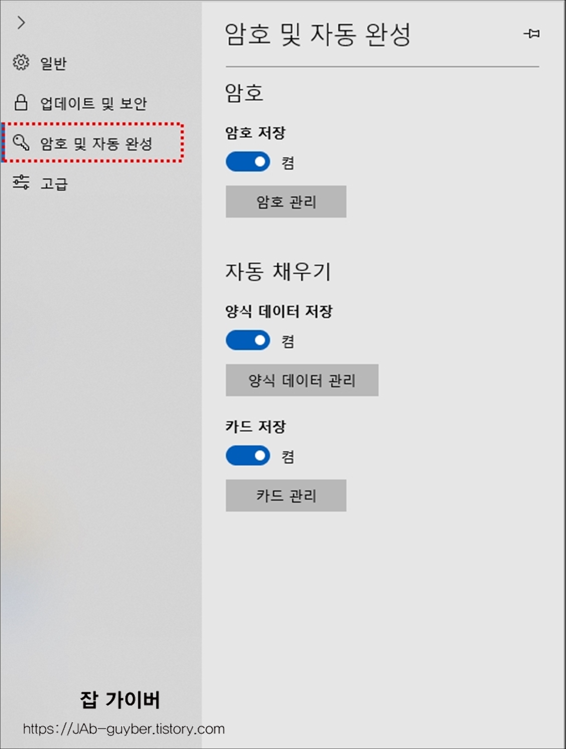 - 자동 채우기 데이터 (양식 및 카드 포함)