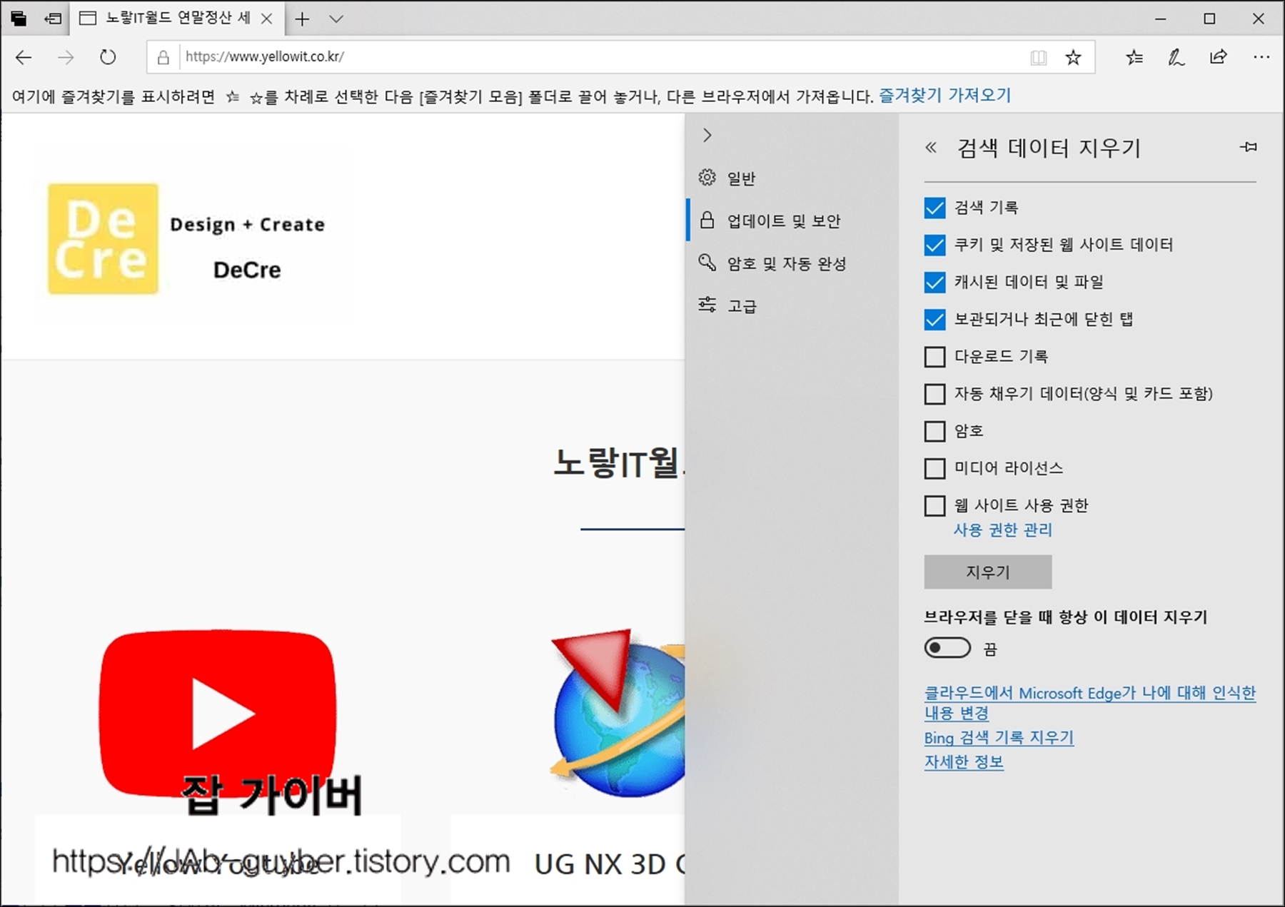 그리고 인터넷 익스플로러 브라우저를 닫을때마다 항상 데이터 지우기를 체크하면 늘 깨끗한 상태로 유지할 수 있습니다.