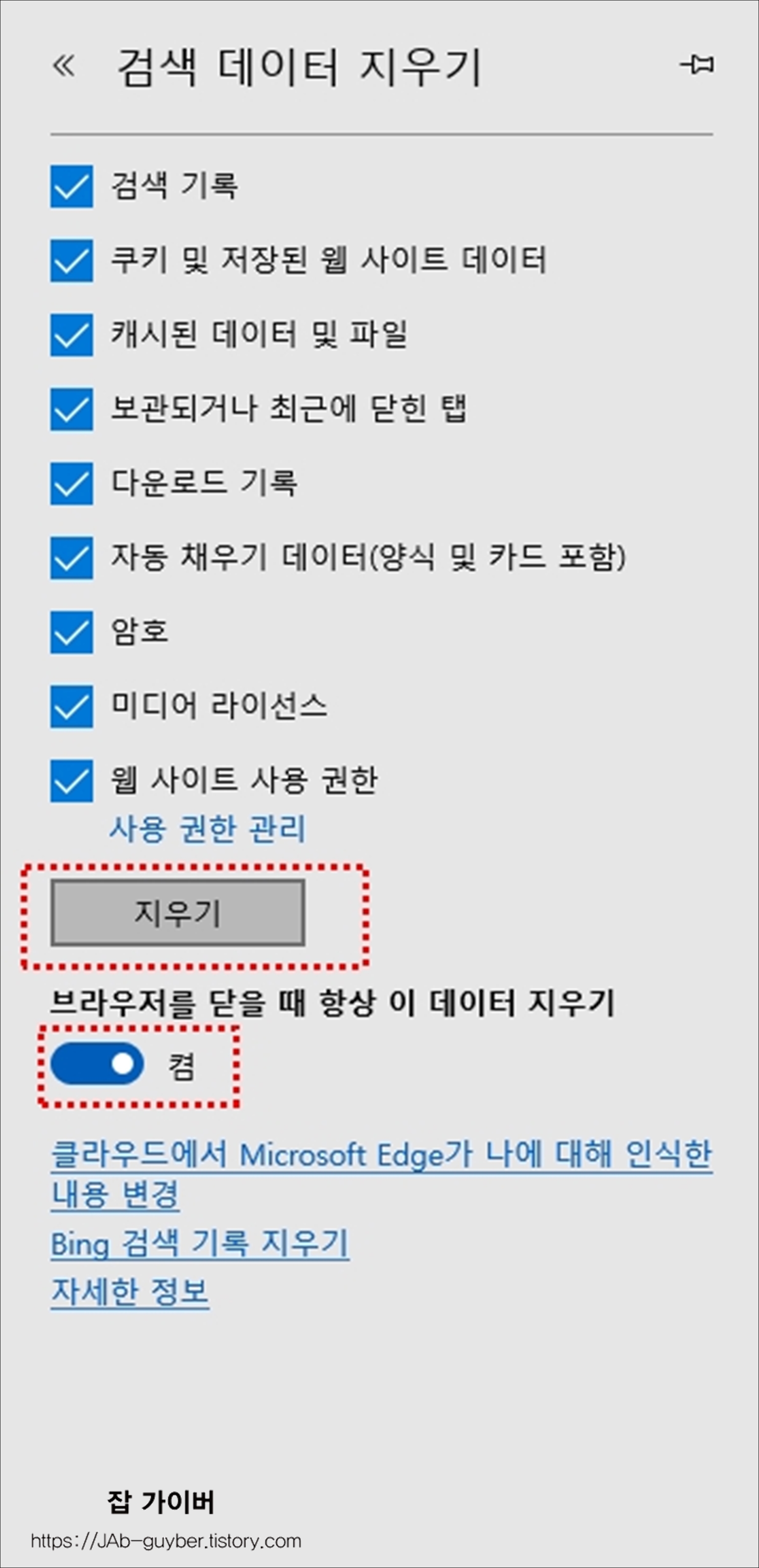 | 종료 시 자동 삭제 설정 | 설정 > 개인 정보 > '브라우저 닫을 때 항상 지우기' 항목 체크 | |