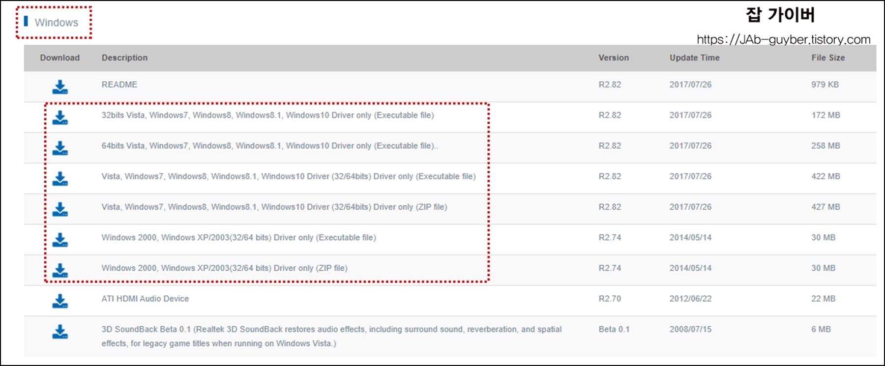 리얼텍 (Realtek)과 같은 사운드카드 제조사는 자체 웹사이트에서 드라이버를 제공하므로, 운영체제와 사운드카드 모델에 따라 정확한 드라이버를 선택하고 다운로드합니다.
