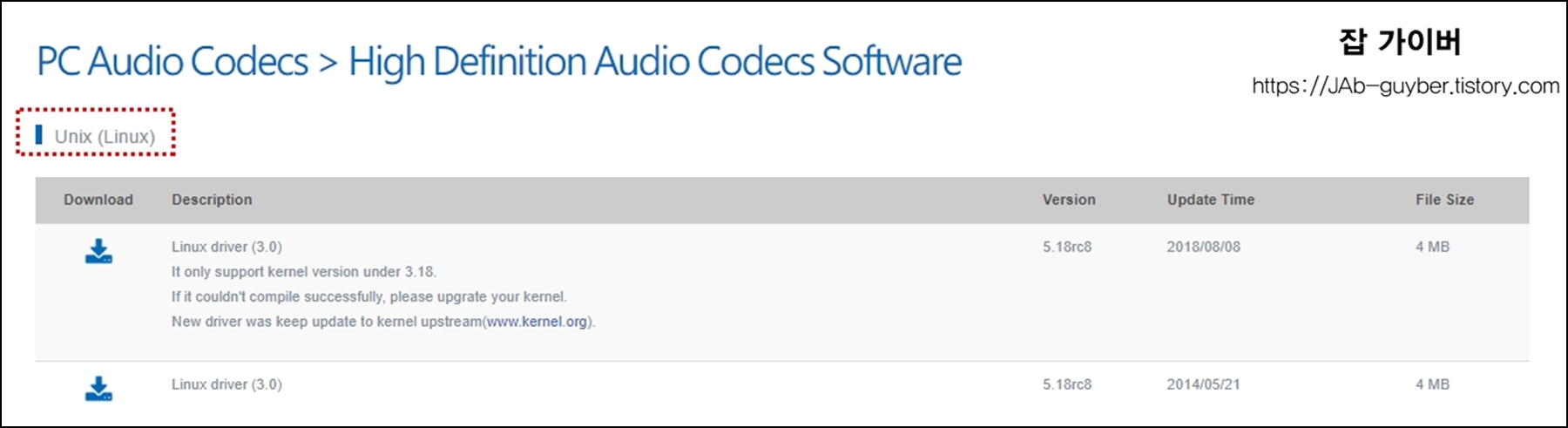 리얼텍 사이트에 접속하면 리눅스에서 제공하는 드라이브는 2가지를 제공하며 2018년과 2014년 두가지만 있습니다.