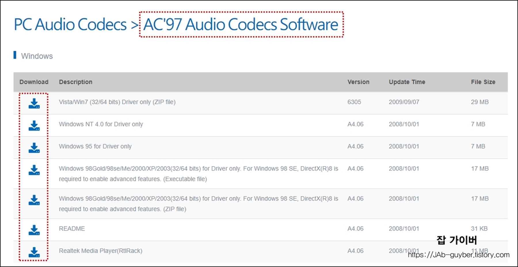 구형 리얼텍 사운드카드 드라이브인 AC9 Audio Codecs Software 다운로드 페이지입니다.